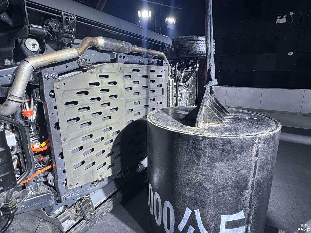 实验场景是这样的,在第二项撞击实验中,BJ60雷霆侧立于地面,自重1吨的金属重物从3米高空下摆撞击向BJ60雷霆底盘,瞬间撞击力达到140000N。实验完成后,底盘无明显变形,电池包未受到损坏。这足见北京越野给这样一台全新动力形式的越野车在动力电池防护上面下足了功夫。