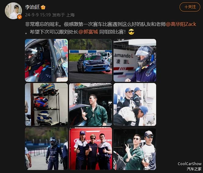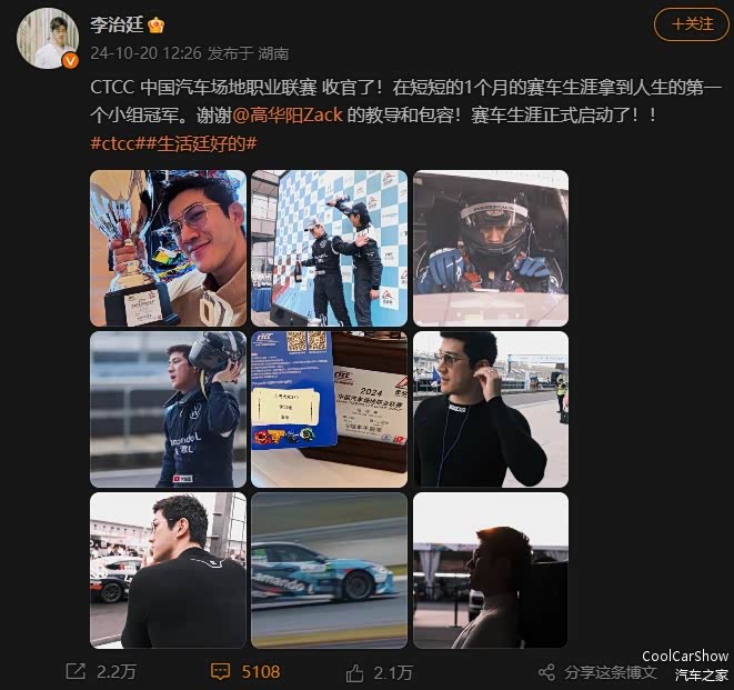 随后李治廷也在个人社交账号上分享:CTCC 中国汽车场地职业联赛 收官了!在短短的1个月的赛车生涯拿到人生的第一个小组冠军。谢谢@高华阳Zack 的教导和包容!赛车生涯正式启动了!PS.看来与“刘处长”同场竞技指日可待。