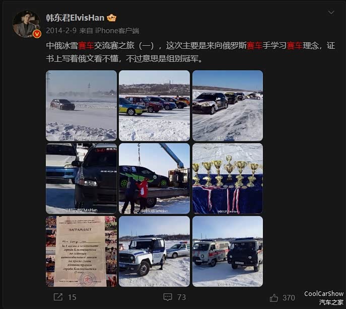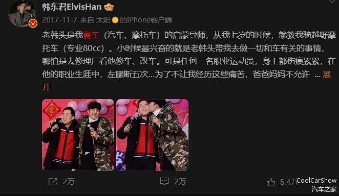 相比起王一博,韩东君的赛车生涯则比较长,而且其父亲是专业的车手,7岁时在父亲教导下骑越野摩托赛车,可以说从小就受到了赛车和改装的熏陶。