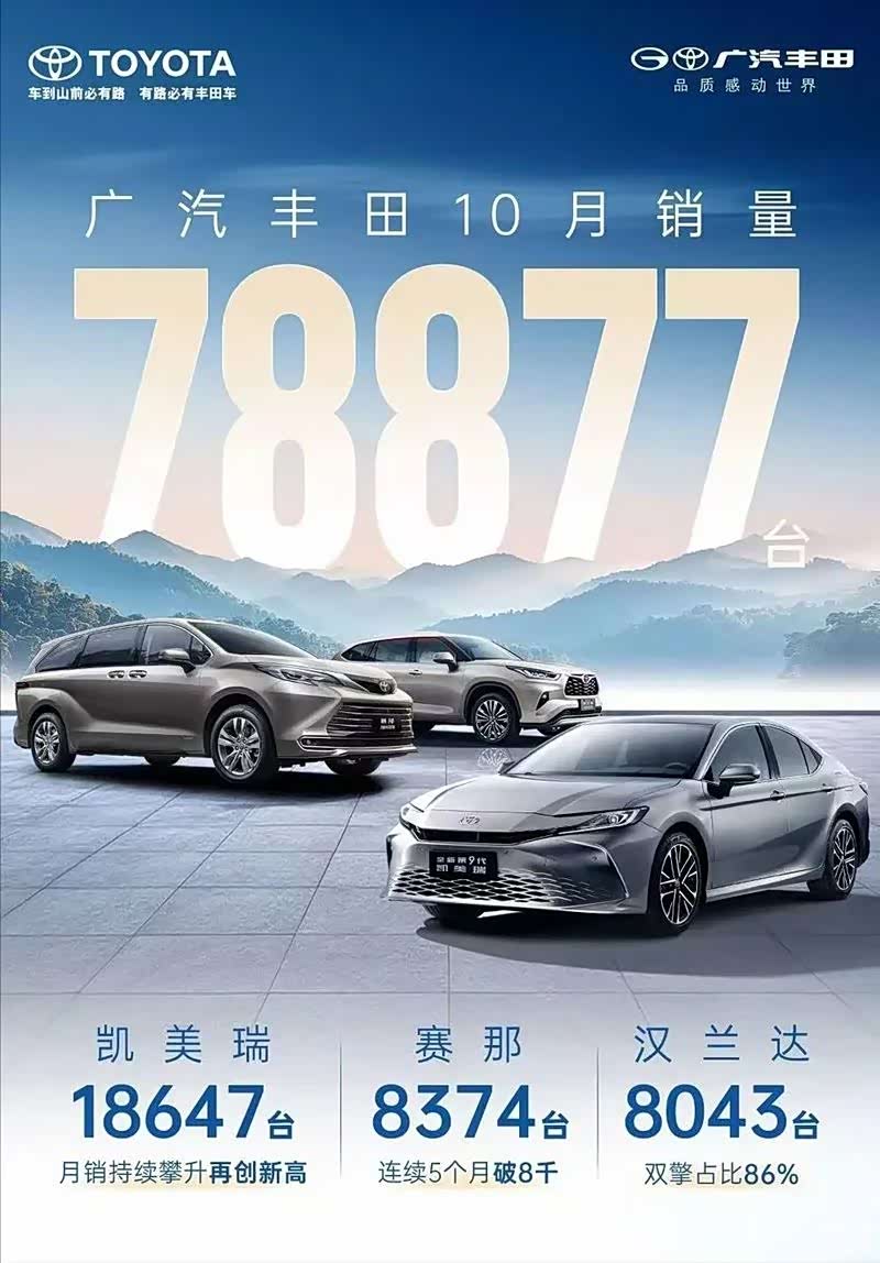 具体车型方面,2024年10月份,广汽丰田凯美瑞的销量为18647辆、丰田赛那的销量为837辆、广汽丰田汉兰达的销量为8043辆。