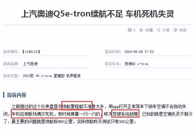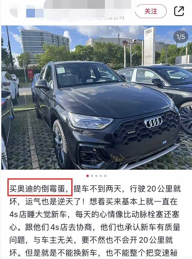 奥迪不仅是燃油车,还是新能源汽车,都频被用户投诉,问题不限于变速箱异响、发动机异响、降速异常、天窗漏水、车机死机、续航里程与官方宣传不符等问题,导致有些车主称自己是“大冤种”。