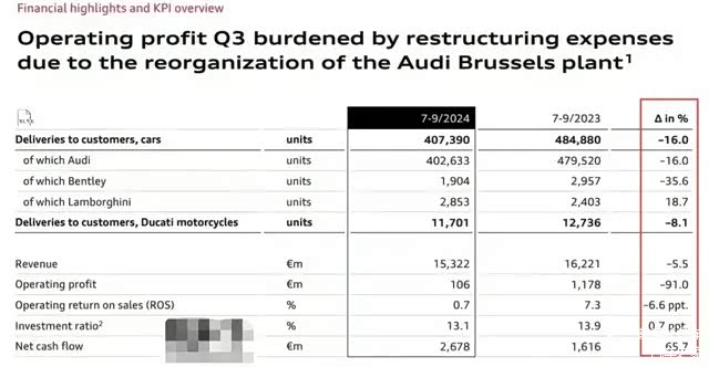 数据显示,奥迪集团第三季度的汽车交付量仅为40.74万辆,较去年同期下降16%,而营业利润更是暴跌91%,仅剩1.06亿欧元。