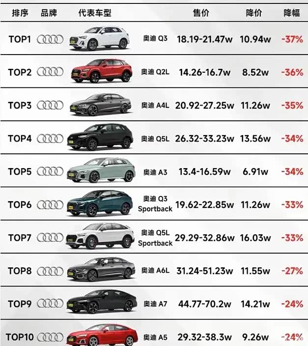 不过,虽说这些车型降价在短期内吸引一些消费者,但从长期来看,却损害了品牌的价值,使奥迪陷入了降价与销量下滑的恶性循环。