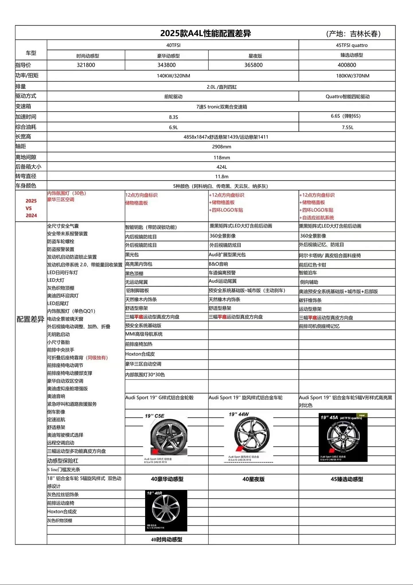 车体的侧边和尾部部分保持不变,车身的尺寸尺寸为4858/1847/1439mm,轴距则为2908mm。车辆提供了阿科纳白、传奇黑、天云灰、纳多灰这四种不同的配色选项,并为用户提供了18、19英寸的各种轮毂选择。与其他车型相比,40 TFSI的星夜版本和45 TFSI quattro臻则会在侧裙部分增添四环的logo贴纸。