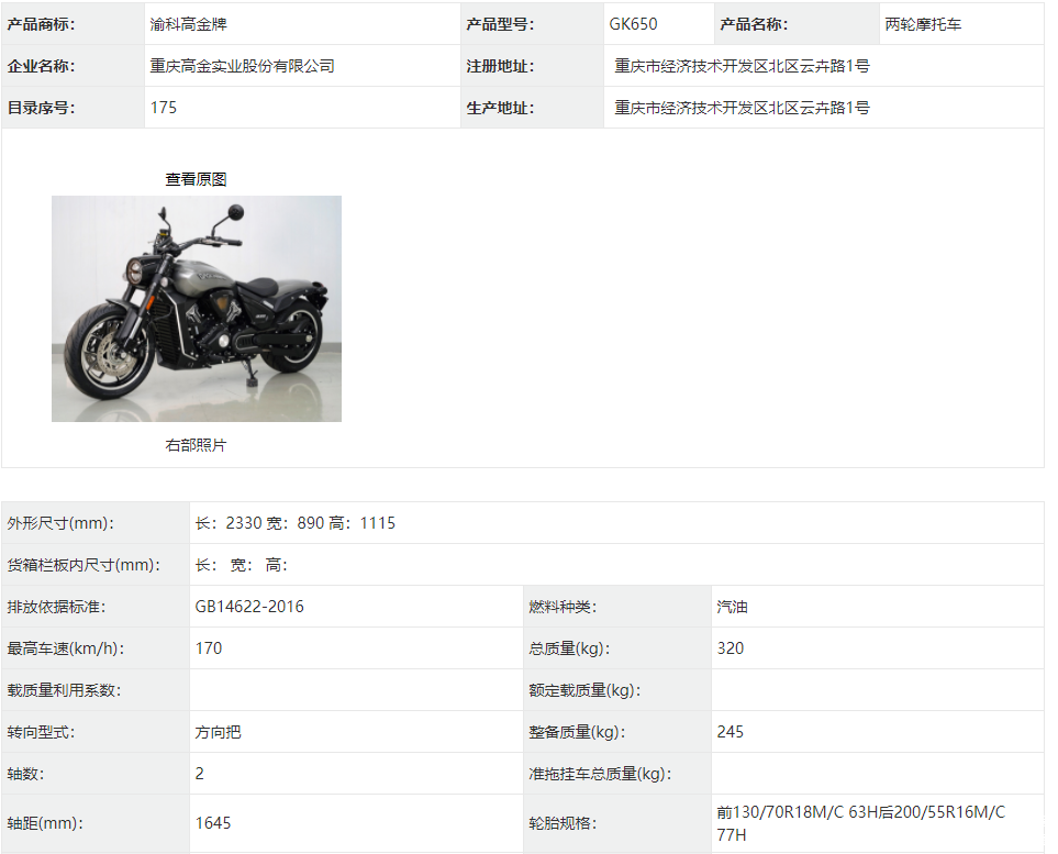 高金推出了一款中排量巡航车,非常有印第安的范。这款新车搭载一台V型双缸四冲程650cc发动机,最大功率41kW,配备国际6挡变速箱,最高车速170km/h,采用皮带传动,整备质量245kg。其他配置目前一概没有公布,只有等上市之后才能揭晓了。