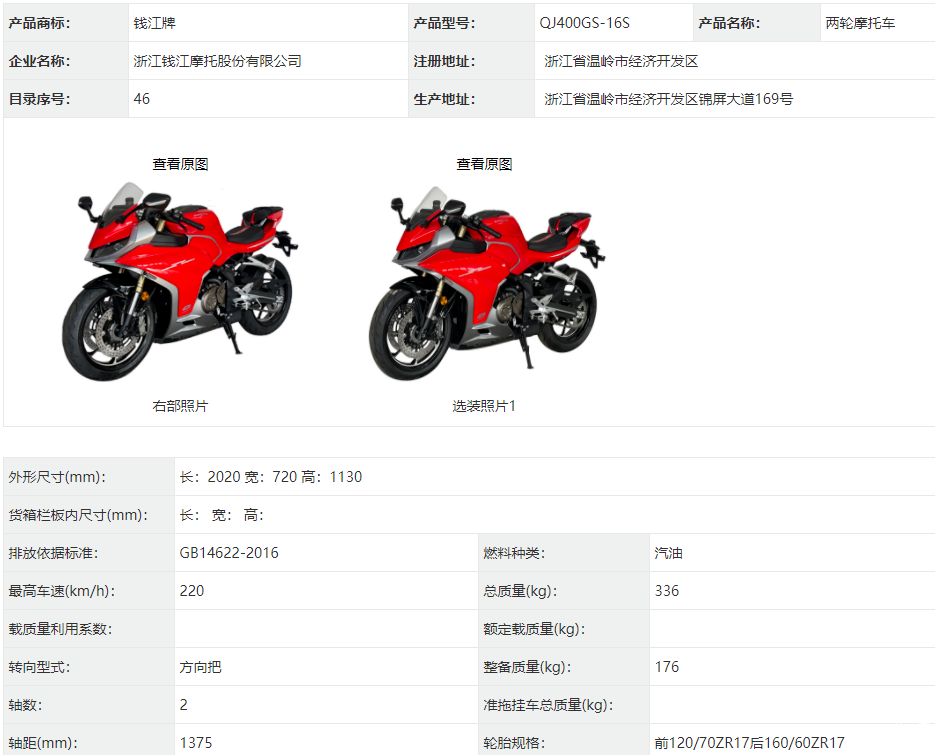 钱江的赛421也即将上市,搭载420cc直列四缸水冷发动机,最大功率57kW,配备国际6挡变速箱,标配前后ABS,整备质量176kg,最高车速220km/h。赛421的其它参数目前还未公布,这款新车除了外观有大哥赛1000的风采,其他方面就有些一言难尽了。