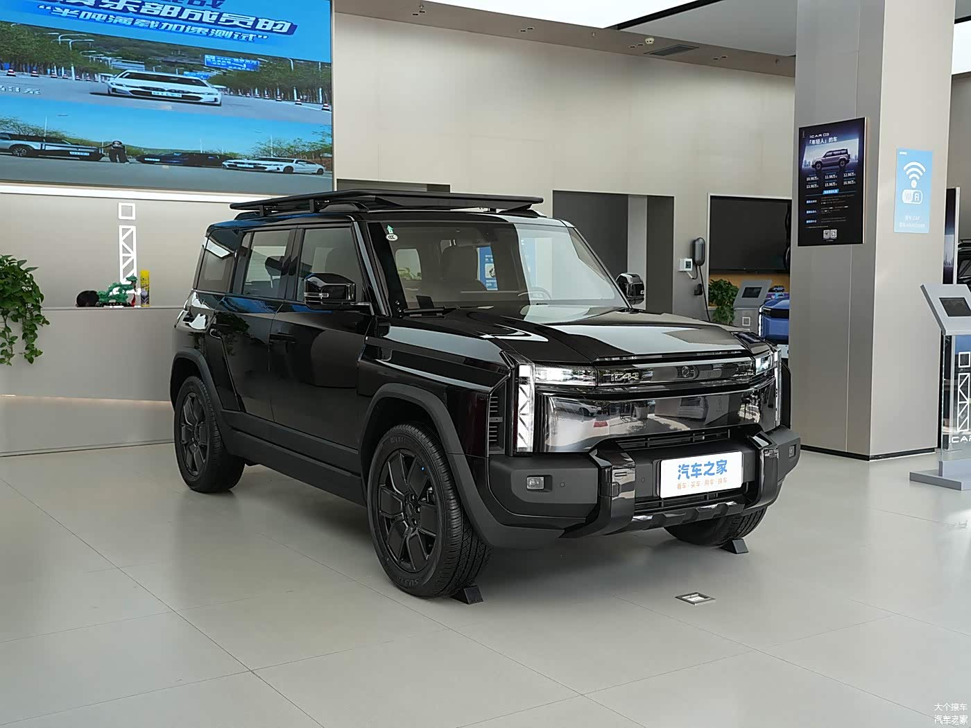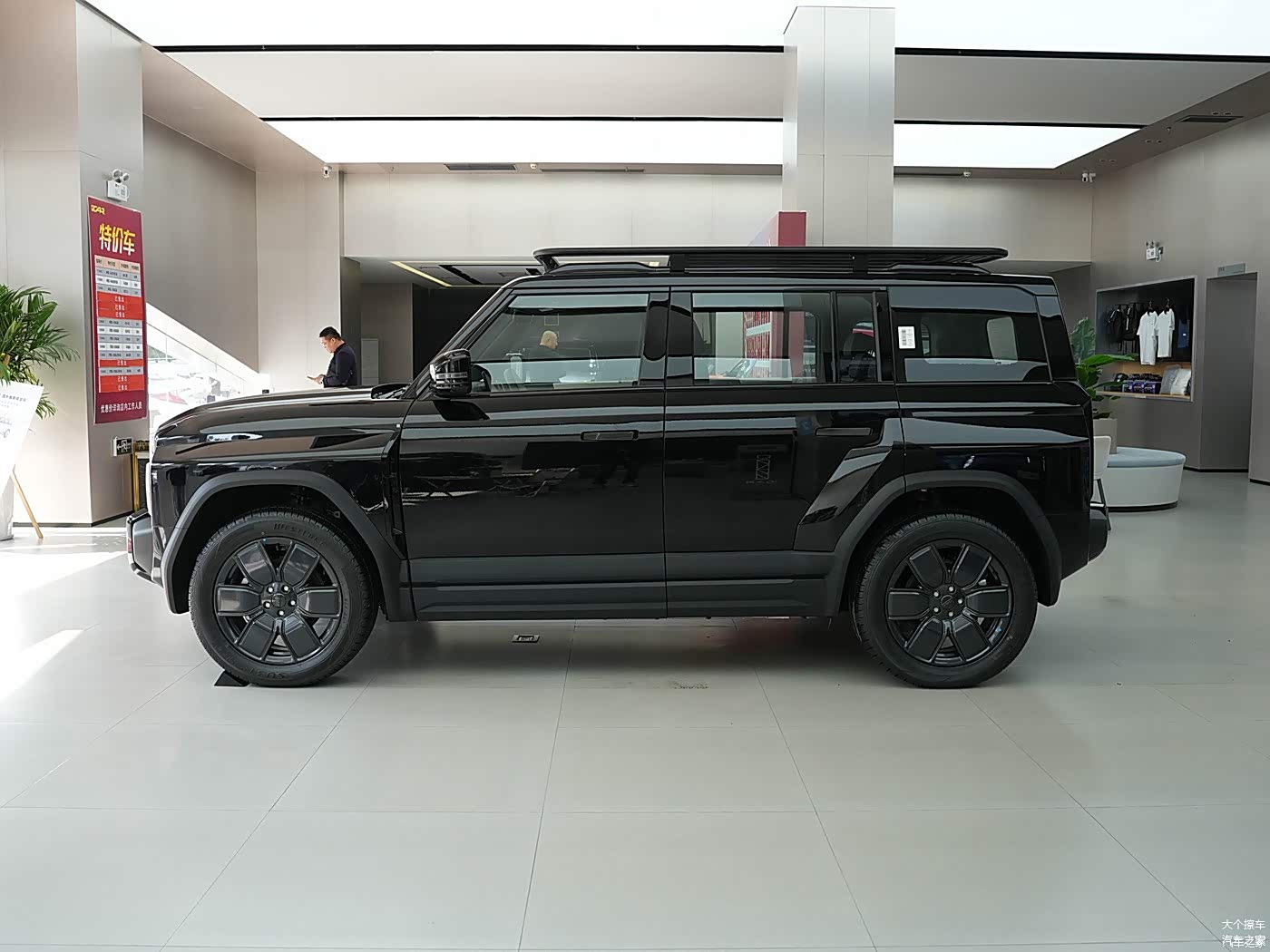 回顾新车的侧脸设计,其车身的整体形态相对规整。车顶平直而醒目的熏黑行李架使得其越野性能得到明显加强。车窗采用了竖向的设计思路。而熏黑C柱的宽厚也使其显得非常坚硬。车门上有许多明显凸起且棱角分明的线条装饰,结合明显的轮眉和隐秘的车门把手,整体呈现出极高的层次感。轮眉的边缘装饰有黑色饰条和多幅熏黑轮毂,这使车辆更加具有运动感。从车身的尺寸上看,新车的尺寸范围是长4380x1916x1741毫米,同时其轴距达到了2715毫米。