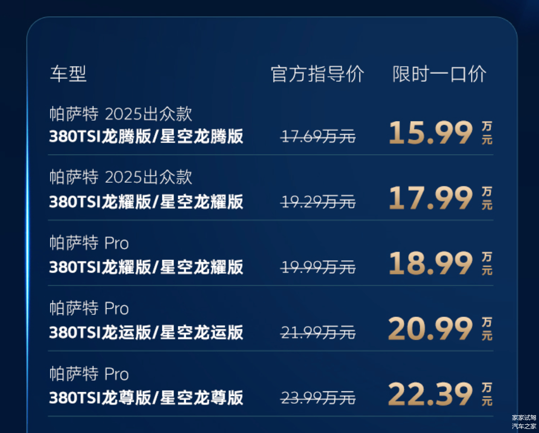 为了全面展示迈腾和帕萨特Pro的实际差异,车型均选取顶配版本,即2024款迈腾380TSI DSG至尊版,指导价为24.69万元;2025款帕萨特Pro 380TSI 星空龙尊版,指导价为23.99万元。在售价旗鼓相当的前提下,我们将从外观、内饰、空间、智能安全、购买政策及用车等多角度进行对比,旨在让大家更清晰的感知两车之间的差异化。