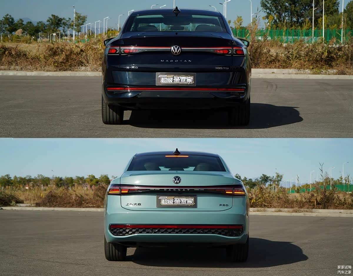 而两车尾部的主要区别在于,帕萨特Pro车身尾部的品牌LOGO与贯穿式尾灯采用的是分离式设计,而迈腾则是将二者整合为一体。从视觉感官的角度出发,迈腾的设计表达整体度更高。