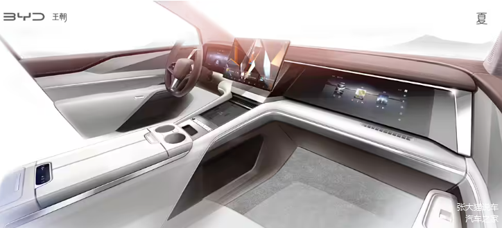 结合此前的官方发布的手绘图,比亚迪夏采用了全新的内饰设计,白棕的撞色设计很有时尚感。车内配备了全液晶仪表盘+悬浮式中控屏+副驾娱乐屏(三屏设计)。值得的注意的是,B柱位置还设计有扶手,为乘客上下车提供便利。