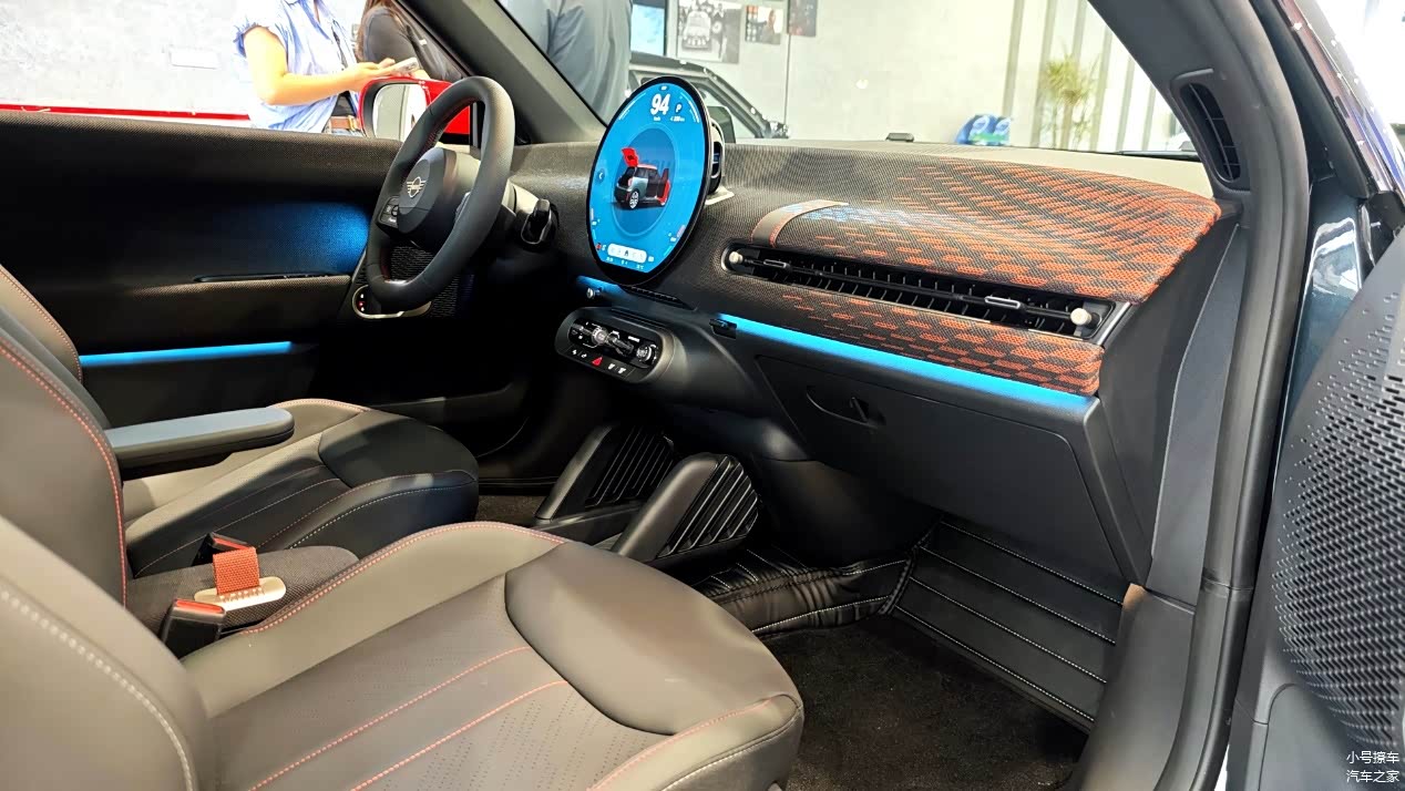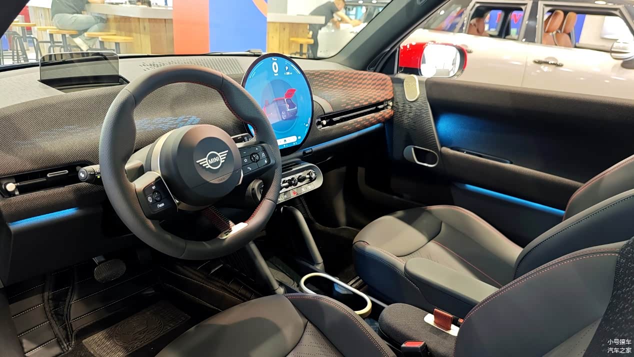 内饰方面属于MINI最新的家族化设计风格,提供有三幅式多功能方向盘、HUD抬头显示、圆形悬浮式中控屏以及拨杆式电子档把,中控台有着比较强的层次感,而且加入了类似织布材质进行包裹,主打的就是一个环保。