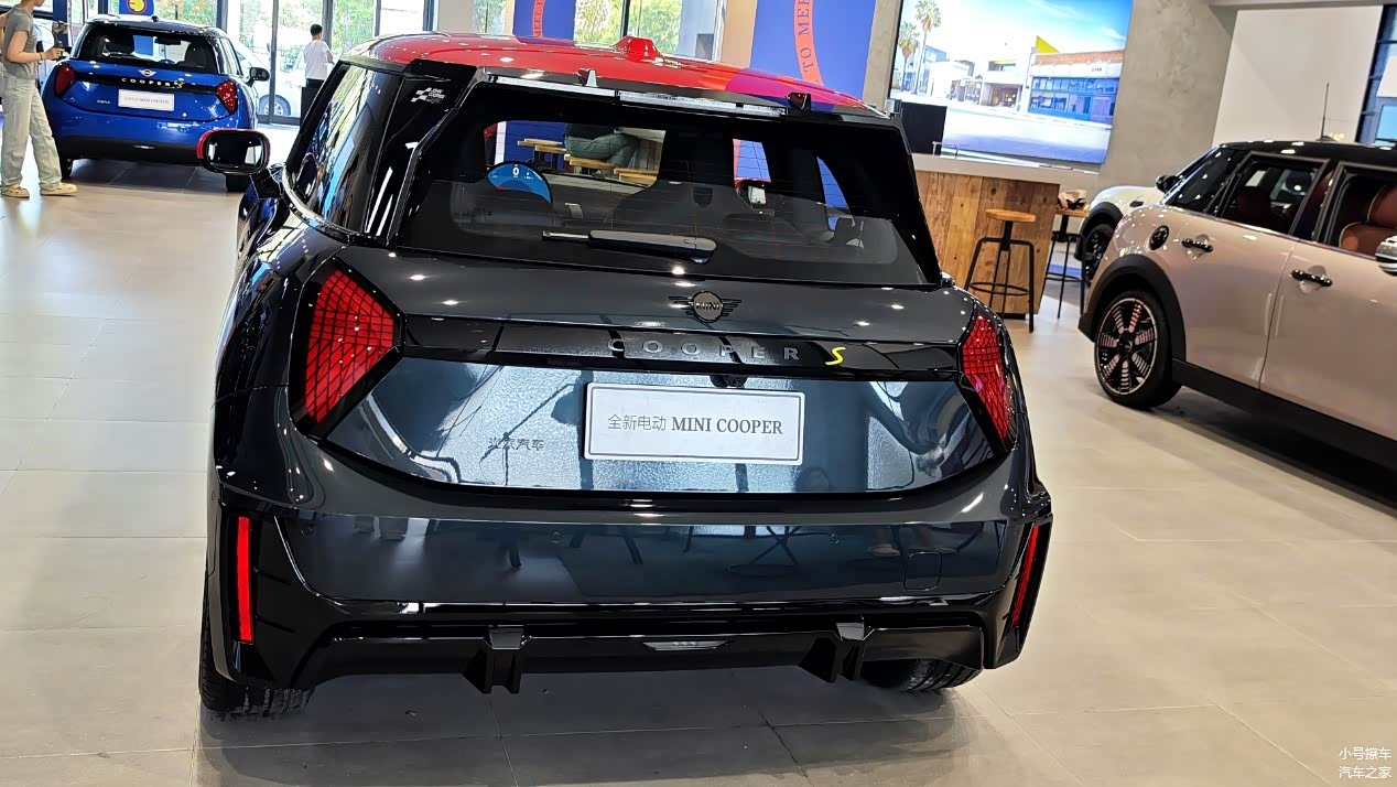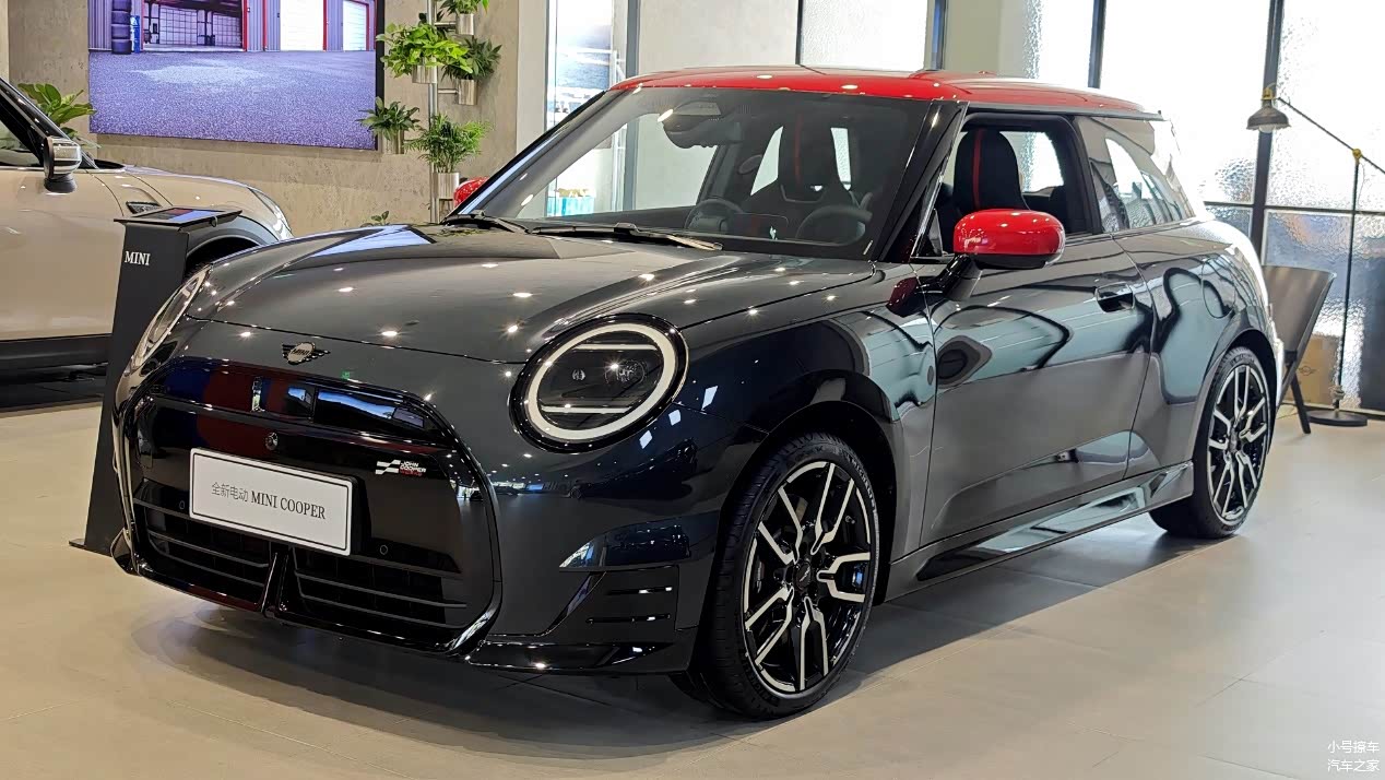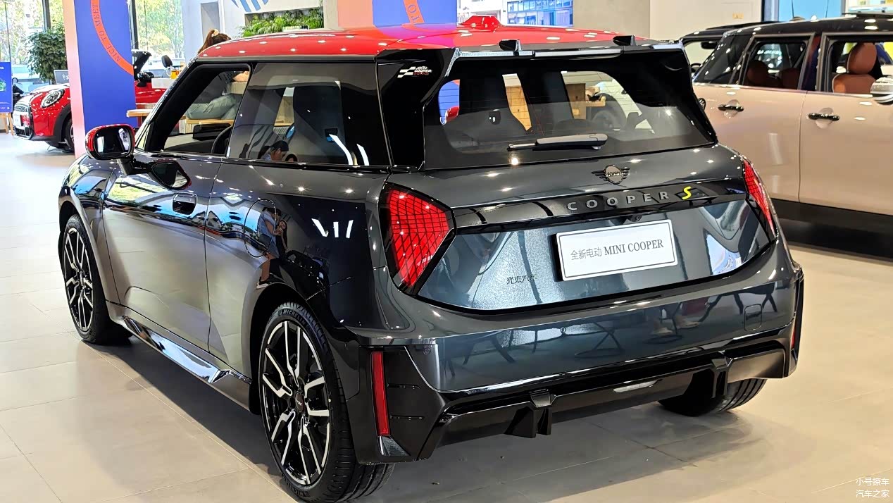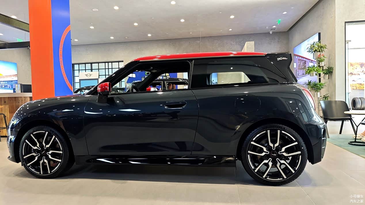 侧面造型方面,车顶线条比较平直,双色车身还营造出了悬浮式车顶,属于MINI的家族化设计语言,风格显得比较时尚;双门设计也让车身显得比较小巧,有那么一丝呆萌感;门把手采用了内凹式造型,能够起到降低风阻的作用;轮毂采用的是双五辐式造型,并非低风阻设计,少了点新能源车的感觉,但风格还算大气。