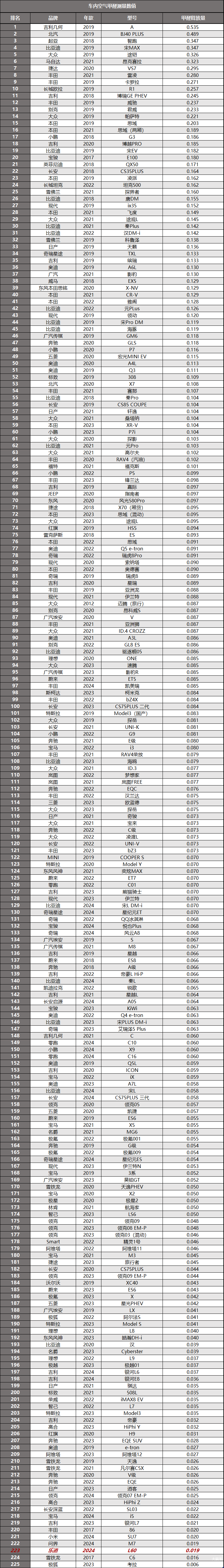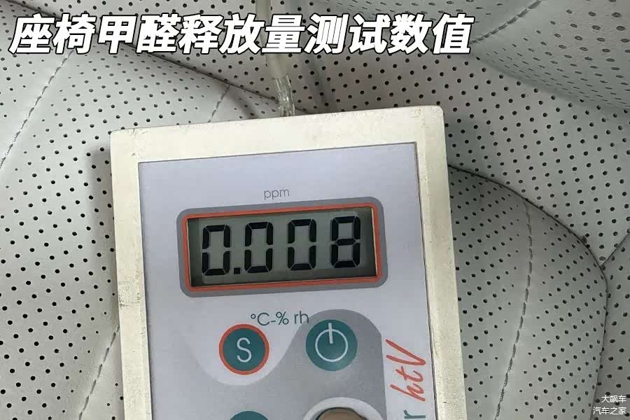 座椅的甲醛释放量测量数值为0.008毫克每立方米,顶棚中的甲醛释放量测量数值为0.012毫克每立方米。
