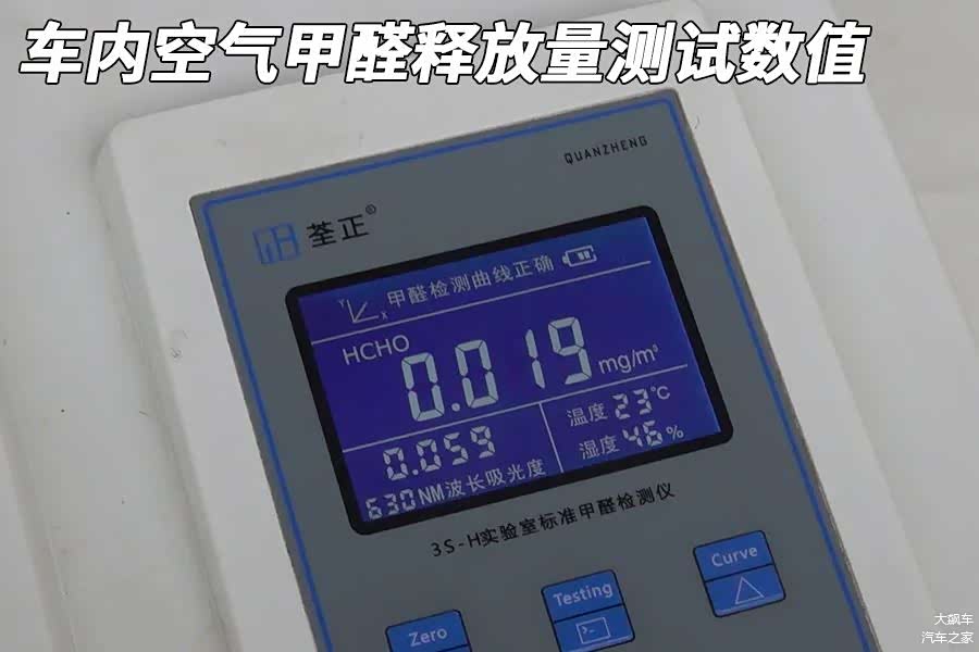 经过在23±1℃恒温环境中16小时的封闭,这辆车的车内空气甲醛释放量测量数值为0.019毫克每立方米。