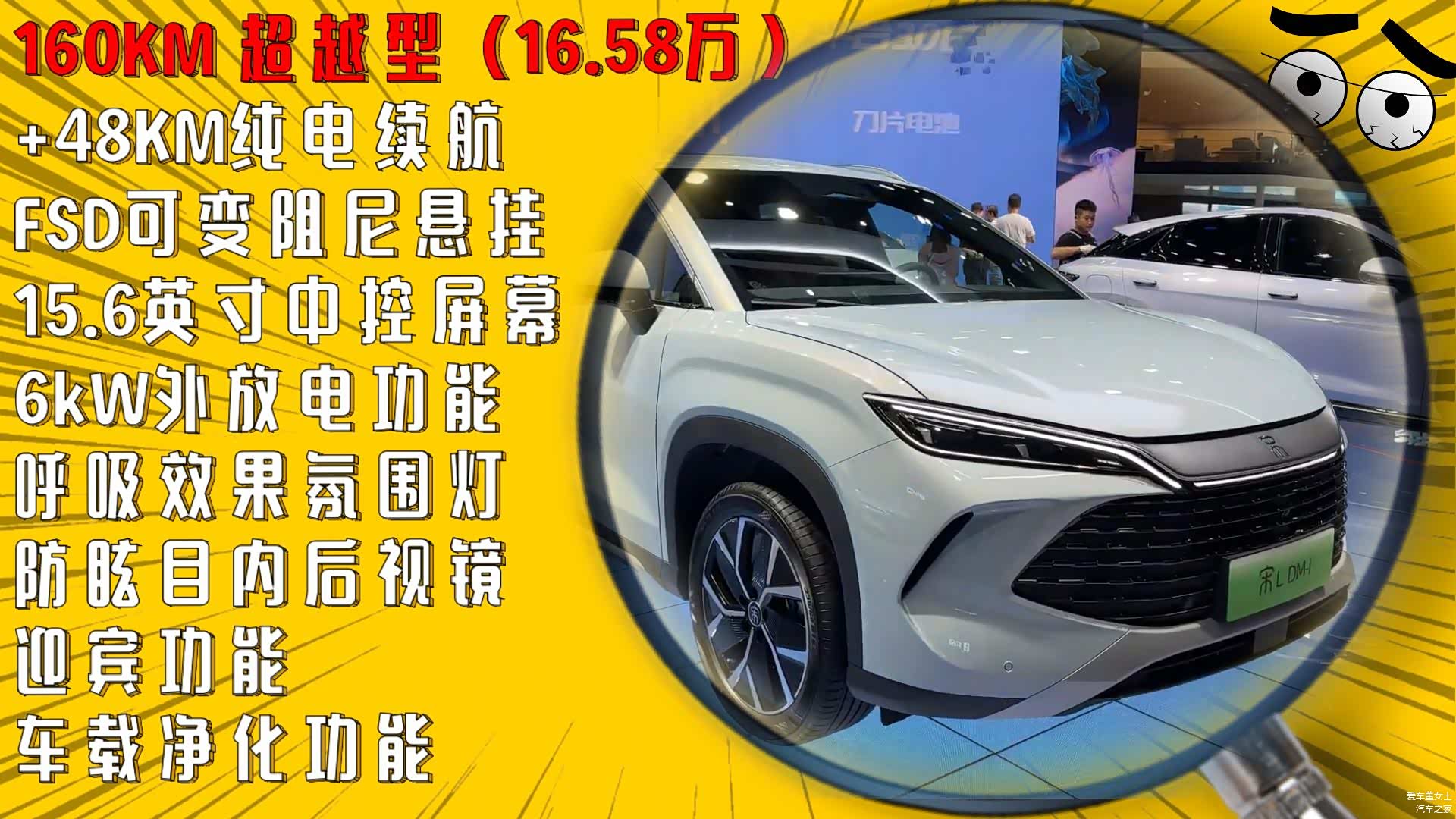 那么160Km续航的版本值得入手吗?先看160Km续航的超越型,除了纯电续航增加外,还多了个FSD可变阻尼悬挂,另外中控屏幕更大了,升级为15.6英寸,外放电功能从3.3kW也升级为6kW,氛围灯有了呼吸效果,内后视镜升级了防眩目,还增加了个迎宾功能和车载净化功能。单看增加的这些东西,1万块钱的差价还是值的。