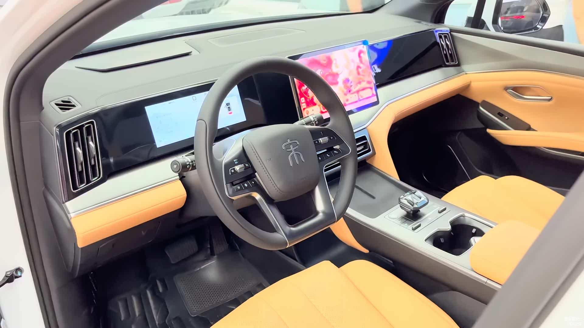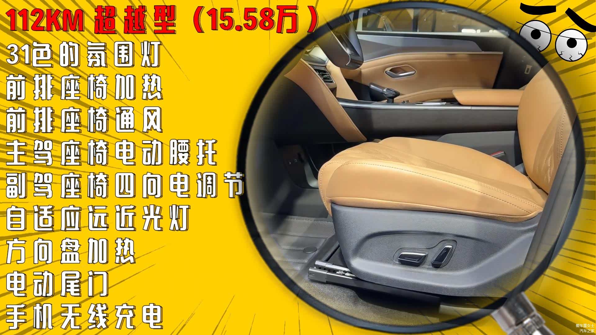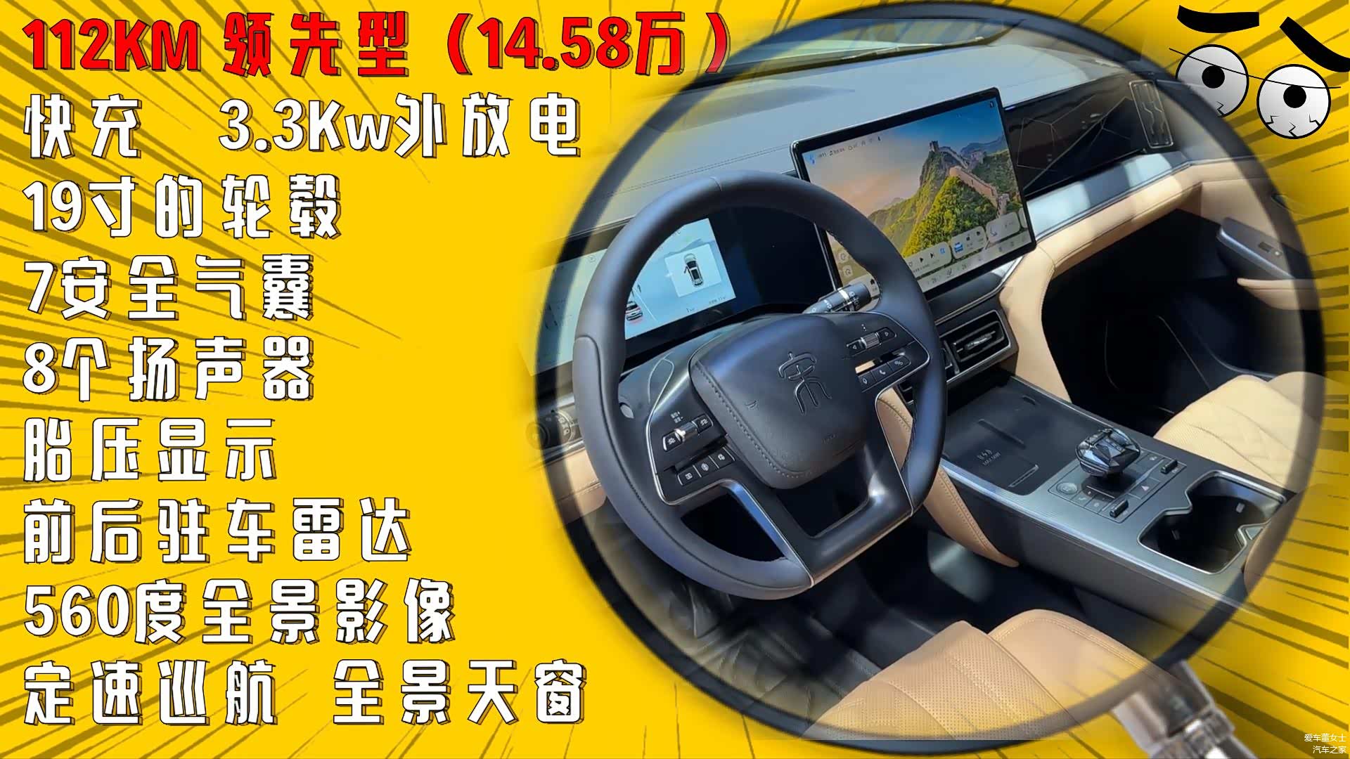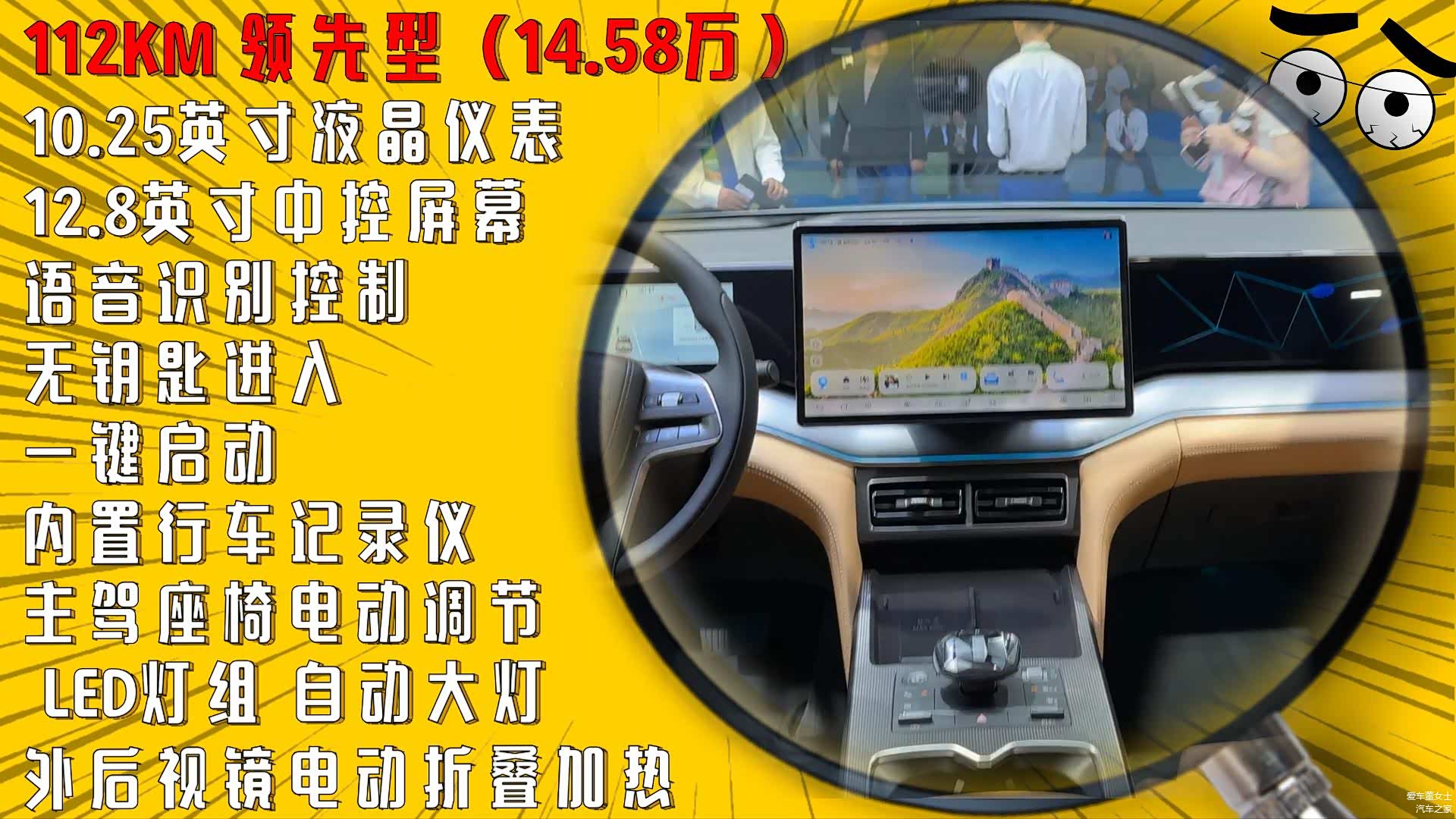 112Km的领先型,这个续航满足大部分消费者,一两天的上下班通勤代步应该是够了,主要就是看配置和价格。配置方面其实还是很基础的,有快充,有3.3Kw的外放电,19寸的轮毂、全车7个安全气囊、8个扬声器、胎压显示、前后驻车雷达、560度全景影像、定速巡航、全景天窗、10.25英寸的液晶仪表和12.8英寸的中控屏幕、语音识别控制、还有像是无钥匙进入、一键启动、内置行车记录仪、主驾座椅电动调节、 LED灯组和自动大灯、外后视镜电动折叠加热等比较基础的舒适性配置。这个版本最大的缺陷就是没有任何的智驾辅助功能,现在的新能源汽车,没有智驾系统,就像是买方便面没有调料包,没有新能源的味道。