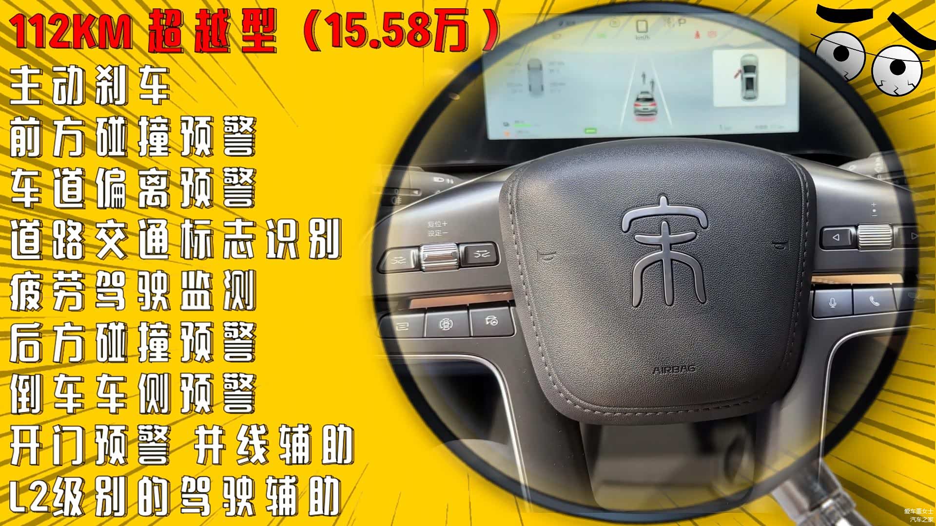 所以你高低的看一眼112Km的超越型。这个版本比领先型贵了1万块钱,多出了23项配置。首先基础的主动安全配置,像是主动刹车、前方碰撞预警、车道偏离预警、道路交通标志识别、疲劳驾驶监测、后方碰撞预警、倒车车侧预警、开门预警、并线辅助以及L2级别的驾驶辅助功能,就全都给安排上了。