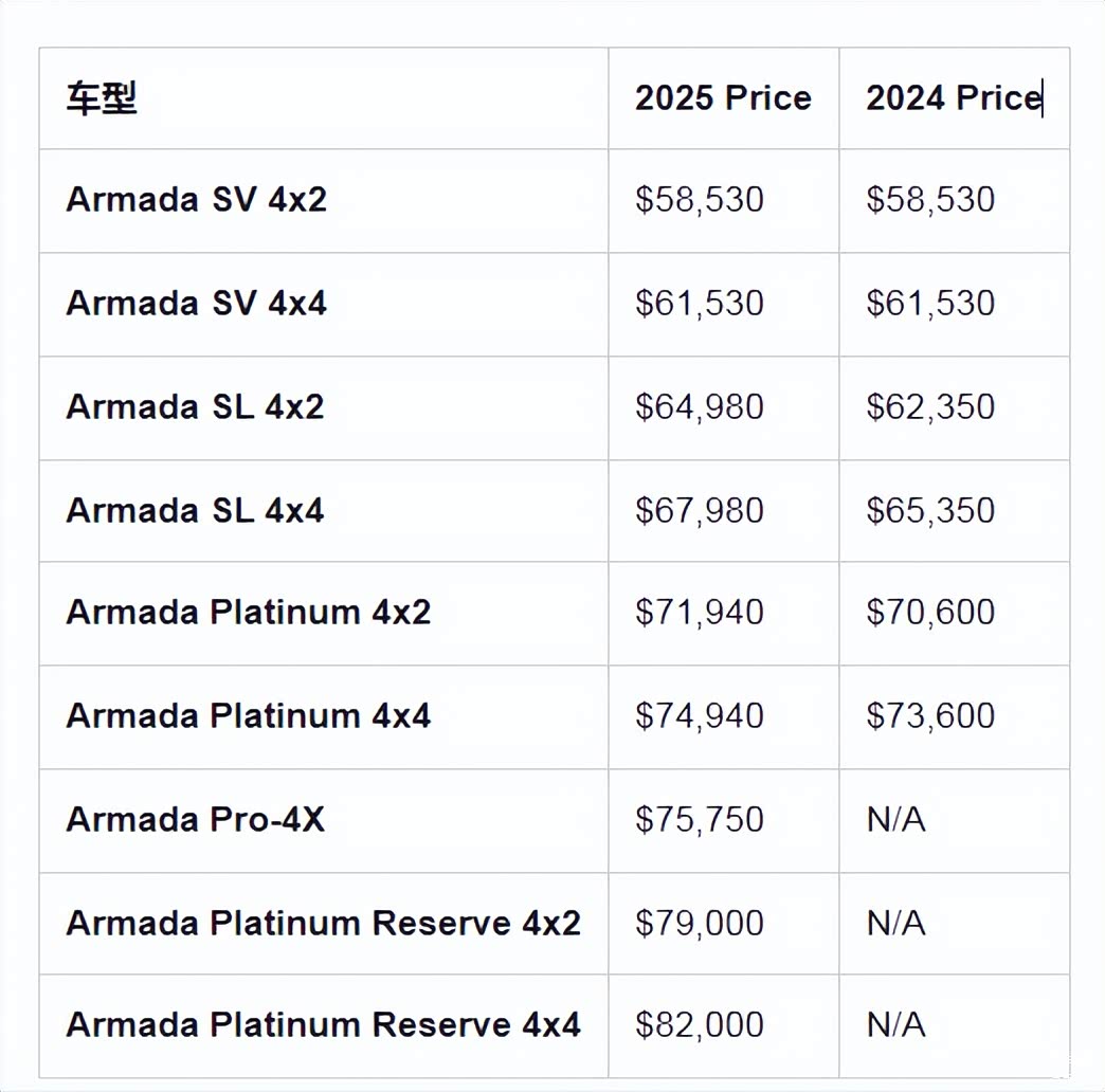 2025款日产Armada( 途乐(图片 | 参数 | 询价))北美售价公布,售价56,520美元-79990美元(约41万-58万元),将于12月开始正式上市销售。