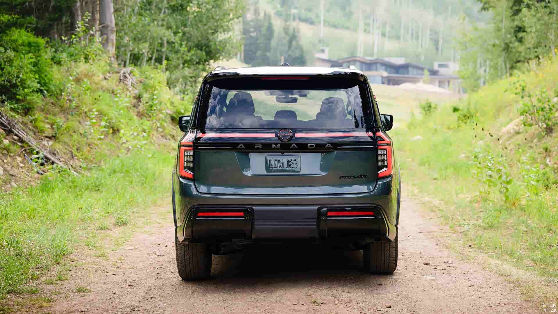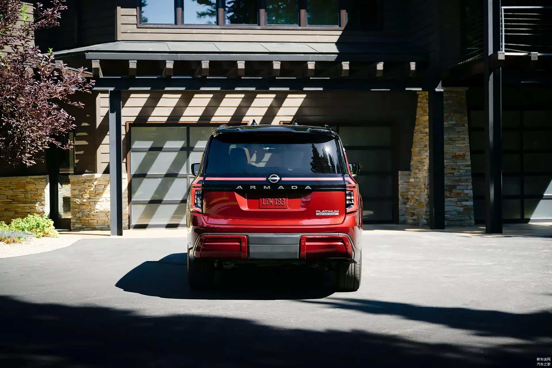 车尾配有贯穿式尾灯,尾灯两侧呈C形,和车头大灯形成呼应,灯带下方是黑色饰板,饰板中间是Armada字标。下包围厚实,配有长条形反射灯,排气管采用隐藏式设计。