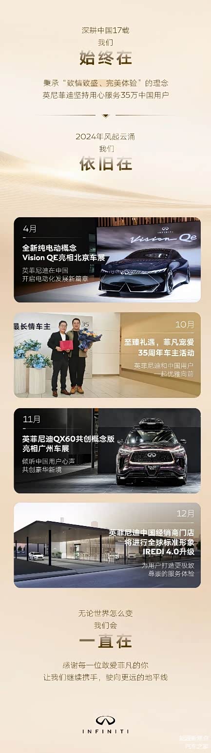 11月19日,英菲尼迪发布“我们一直在”官方宣言,坚决回应击退最近甚嚣尘上的“英菲尼迪将停止国产,退出中国市场”传闻。“深耕中国17载,我们始终在;2024年风起云涌,我们依旧在;无论世界怎么变,我们会一直在。”在此篇宣言中,英菲尼迪如此表达深耕中国的坚定。