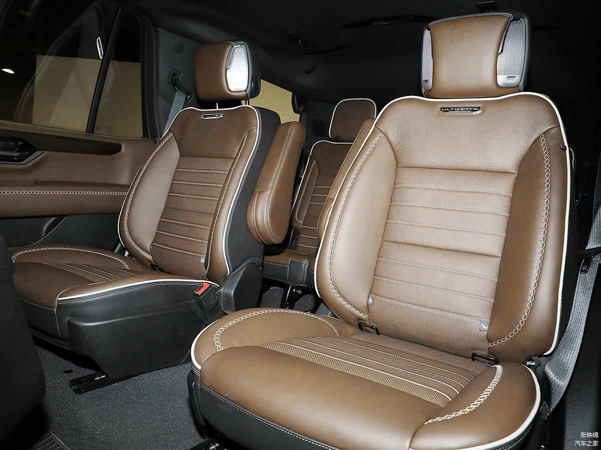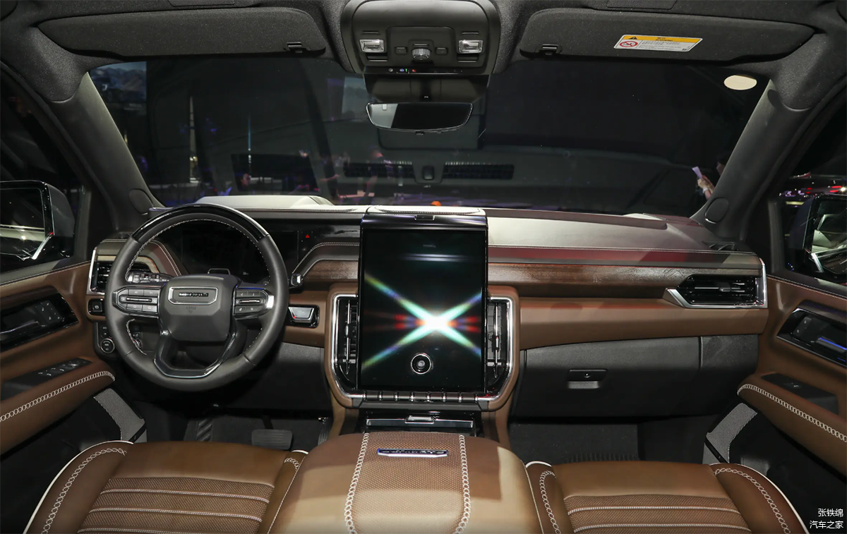 内饰部分,中控台是家族式的设计风格,整体造型很硬朗粗犷,中控面板使用了大面积的皮质缝线装饰,还搭配了木纹装饰板以及镀铬装饰。新车使用了内嵌式的仪表盘和悬浮式中控大屏,标配Super Cruise超级辅助驾驶系统。四幅式的方向盘带有木纹装饰,造型很有力量感。