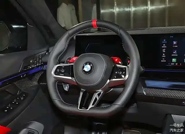 在内饰部分,宝马新版本的M5 PHEV中控台配备了三幅式M设计的运动平底方向盘(支持电动调整、回忆和换挡功能)、HUD抬头显示系统以及12.3英寸的液晶显示器和14.9英寸的中控屏幕,形成了中控的双联屏。