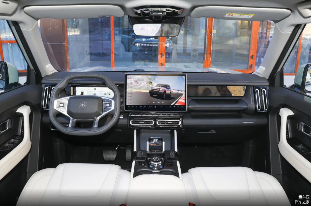 内饰方面:捷途山海T1的车内造型设计也采用了偏硬朗的风格,米白色+黑色的组合形式,中控台与内饰板也有着大面积的软性材质,而中控台布置了15.6英寸(12.8英寸)和10.25英寸液晶仪表盘为车内营造出更多的科技感。而挡把周围还提供了包括驾驶模式选择、无线充电等功能,都在这片区域可以找到。