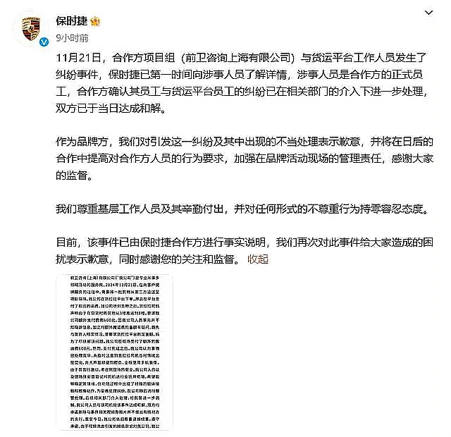 同时在这起事件中存在运费争议并产生冲突的一方实际为保时捷工作人员,于是保时捷汽车也对此进行了回应。保时捷称:对该纠纷表示歉意,涉事人员是项目合作方的正式员工,双方已于当日达成和解。