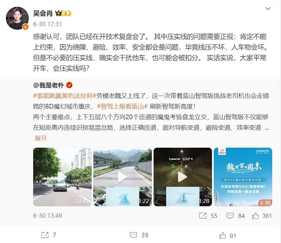 不过,长城的城市NOA在当时的直播出现了压实线变道的争议动作。对此,吴会肖在社交平台上发文表示,“压实线的问题需要正视”,并承诺日后会进行改进。