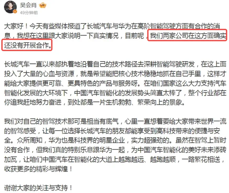 但是,合作传闻马上就遭到了长城汽车高管的否认。11月22日,长城汽车CTO吴会肖在社交平台上辟谣,“目前我们两家公司在这方面确实还没有开展合作”,第一时间否认了长城汽车采用华为智驾的传闻。