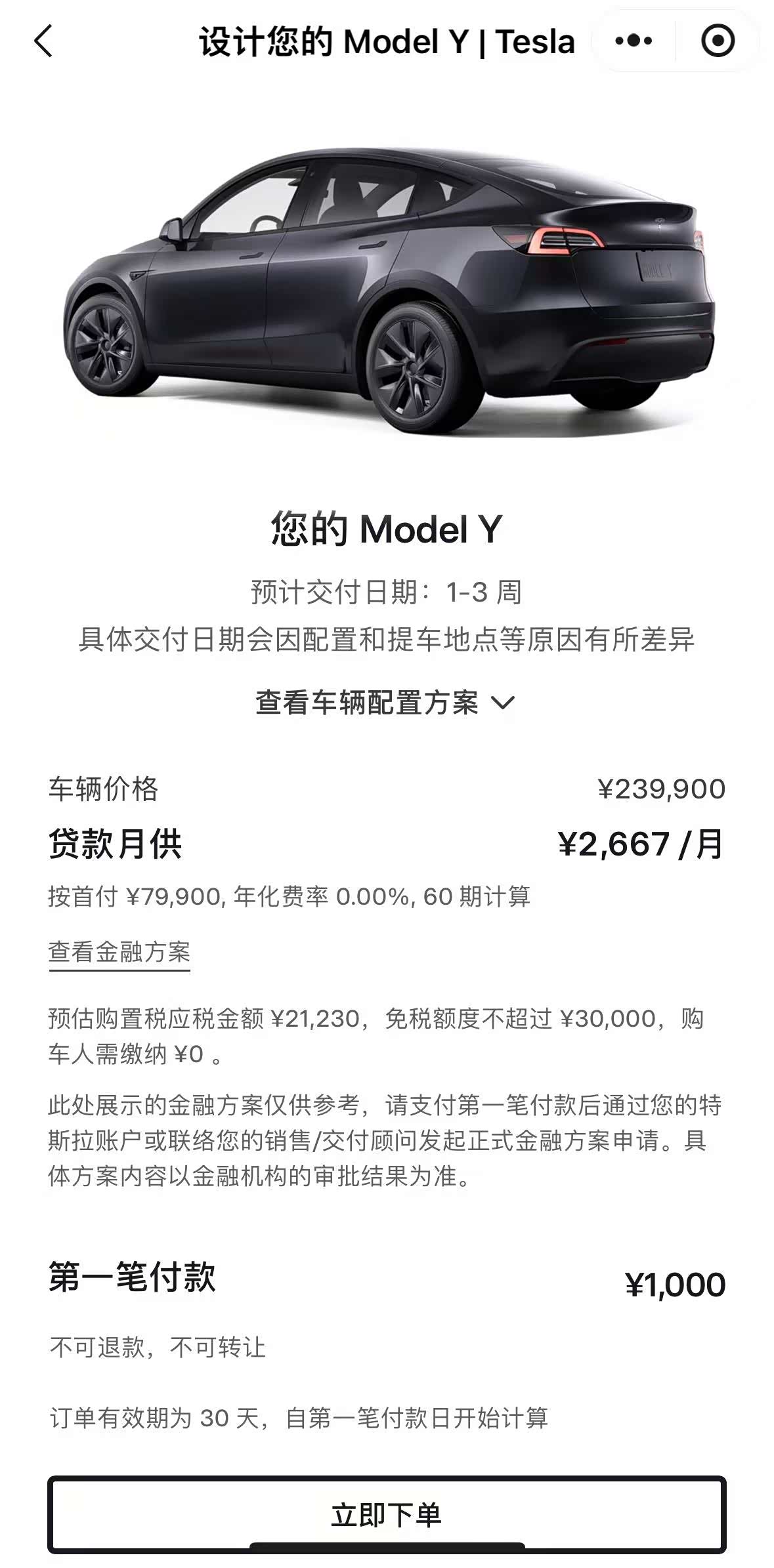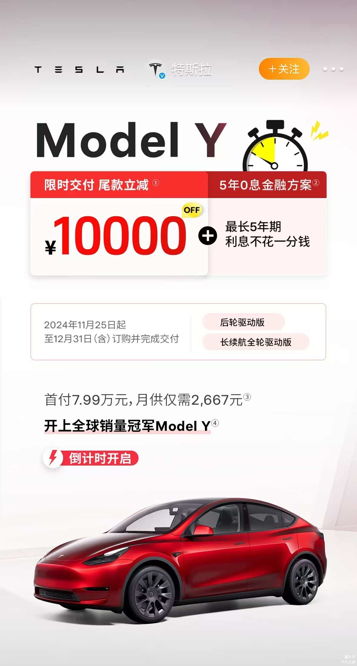 根据特斯拉微博消息,11月25日-12月31日订购并完成交付,Model Y后轮驱动版和长续航全轮驱动版车型尾款立减10000元,售价23.99万元起,并叠加5年0息金融方案,首付7.99万元,月供仅需2667元。