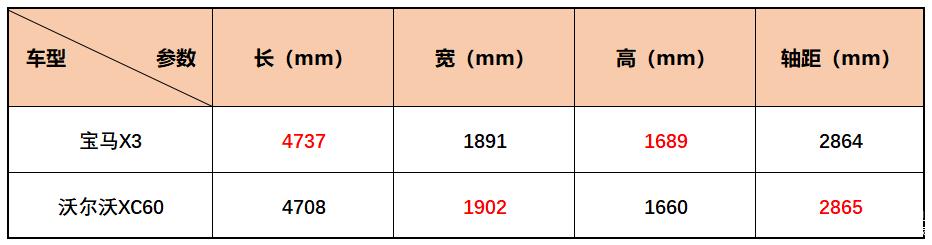车身尺寸方面,宝马X3的长宽高分别是4737/1891/1689mm,轴距为2864mm,而沃尔沃XC60的长宽高分别为4708/1902/1660mm,轴距为2865mm。从数据上看,两款车型在中型SUV的体量逐渐成为“偏小”的体格,对比来看,宝马X3的车长和车高更突出,而沃尔沃XC60的车宽更占优势,轴距则相差无几。