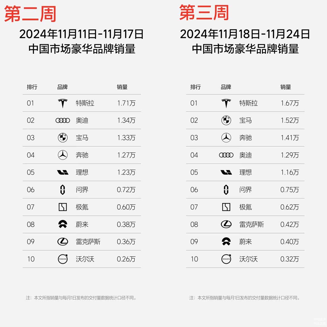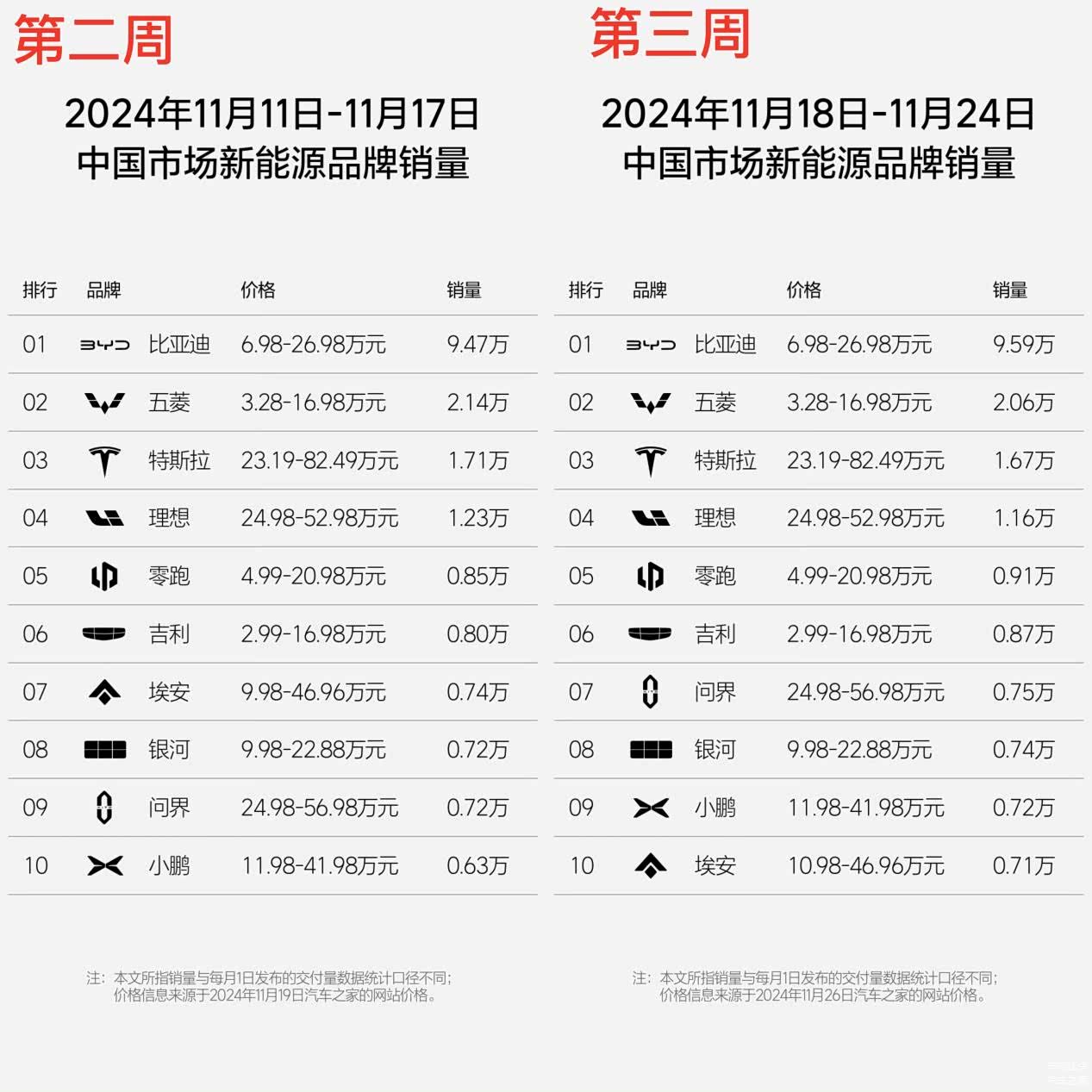 11月26日,国内乘用车市场部分车企品牌本月第三个完整周(11月18日-11月24日)销量出炉。从数据来看,大部分新能源汽车品牌销量都实现了“稳中有进”。从排名来看,在新能源汽车品牌、高端车品牌以及自主新势力品牌阵营,比亚迪、特斯拉以及理想汽车仍分别位居各榜单销量第一。