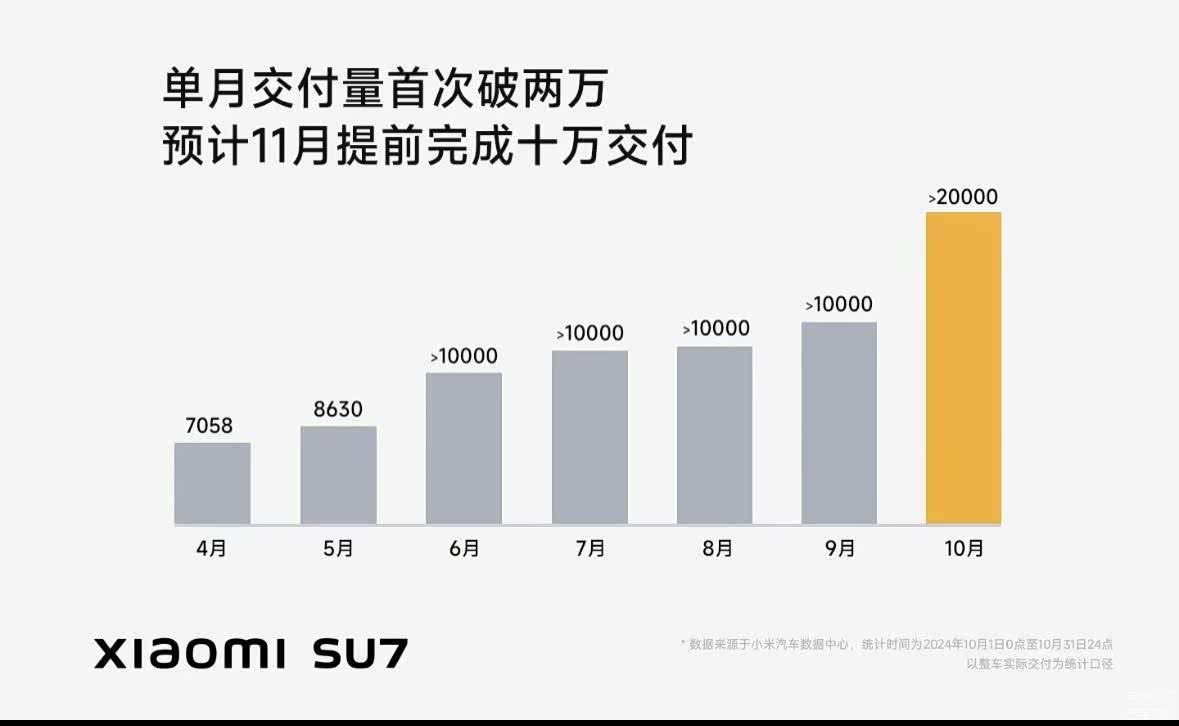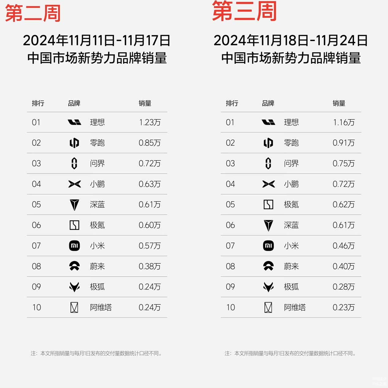 在新势力榜单中,值得关注的还有小米汽车。相比于大部分车企逐周增长的势头,小米汽车本月第三周却略有下滑,周销量为0.46万辆。10月份,小米汽车首次月销量超过2万台,本月,小米汽车将提前完成年销量10万辆的目标。