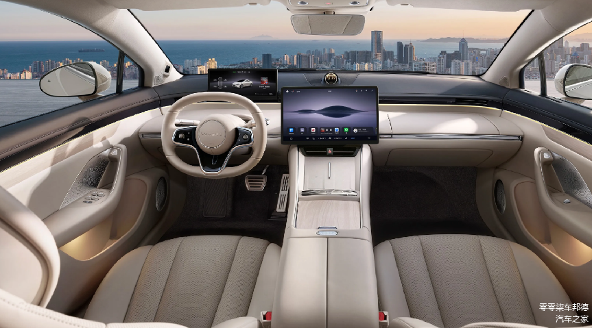 在内饰设计方面,车型配备的是环抱式游艇座舱,座舱采用Nappa纹亲肤软包和超纤麂皮绒顶棚,座椅升级为环保水性素皮。车内搭载12.3英寸高清远端领航屏和15.6英寸中控大屏,主副驾驶座椅配备多项调节功能,后排座椅支持27°/32°可调、通风/加热等功能。除此之外,全车还应用100+项风噪控制技术和多级隔振设计,标配电吸门、电弹门和静音轮胎。车辆还配备了双层镀银隔热天幕和后排隐私玻璃,后备箱容积为420L,可拓展至1450L。