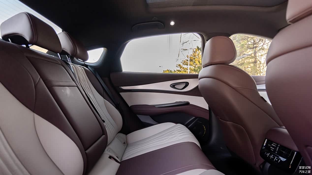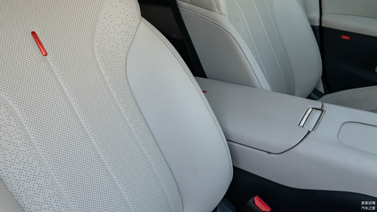 领克07 EM-P的轴距呢是2843mm,你仔细看,后排座椅左右两边的坐垫具有明显的凸起,坐垫厚度达到了21cm,对两边乘客大腿的承托性会更好。不仅如此,整个后排座椅的宽度达到了132cm,再加上其1900mm的车宽,后排同时乘坐三人的情况下,舒适性要强于比亚迪海豹07 DM-i。