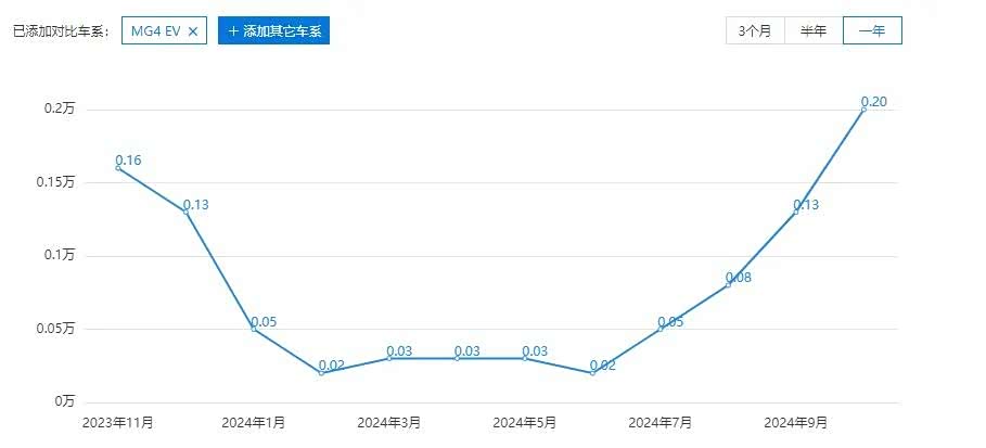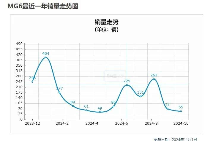 售价10.98-13.98万的名爵6靠着7秒级的零百加速,和运动性十足的外观,一度成为了当时对标东风本田思域的车型。也曾多次月销破万, 第二代名爵6曾创下了车系最高单月销量的成绩,达到了13,596辆。不过至此之后,名爵6销量一路走低,即便是完成了车型换代,也无法挽回销量败局。名爵6在今年10月份销量为可怜的55辆,2024年的月销基本在300台以内,2024年全年累计销量仅为可怜的1227辆。
