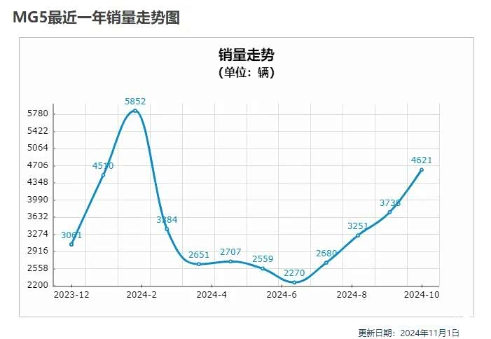 MG名爵品牌总经理陆佳俊表示:新一代MG5是10万以内最好的代表,预计新一代MG5的目标是月销在5000+辆。哪知随即就被打脸,随后几个月的销量表现显示,8-10月的销量分别为3251台、3738台、4621台,都没过5000台大关,还不及老款MG5在2月份5852台的表现好,正所谓是表示越来越差。截止10月份,MG5在2024年累计销量为33713辆。