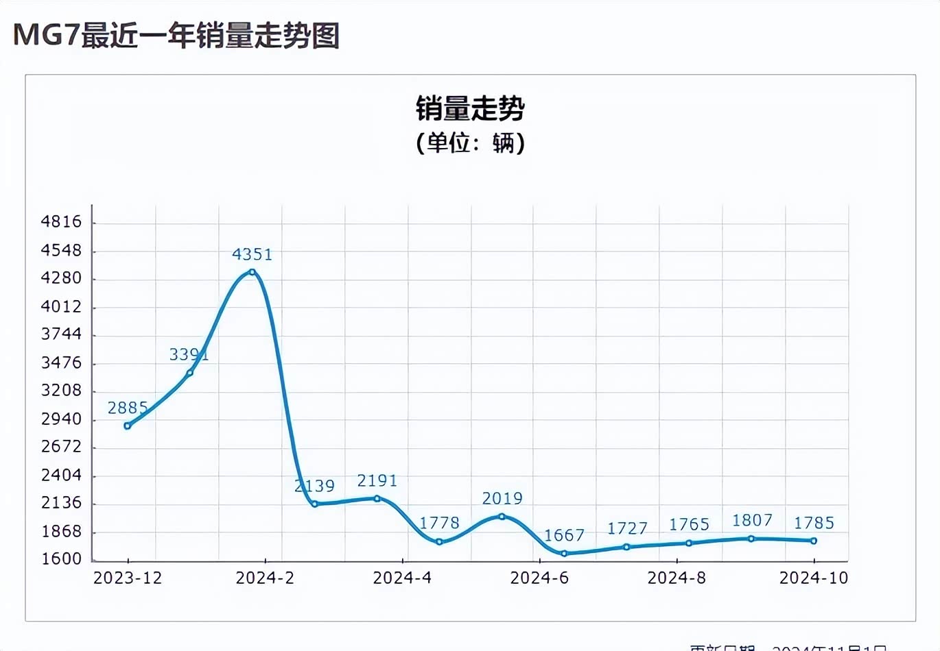 作为“中国B级车”国产帕拉梅拉称号的名爵MG7的表现也是一言难尽,其实针对于这类车型,它有一个绝对的弊端,那就是受众太少!说难听点,这类车型的定位只适合于“没有多少钱且拥有个性的年轻人”!名爵7陷入了一个非常尴尬的境地,买得起的看不起,看得起的买不起,以至于造成销量虚空。从今年2月份起,销量一路断崖式下滑,从6月到10月月均销量1600-1700台;最新月销量为1785辆,2024年累计销量为21229辆。