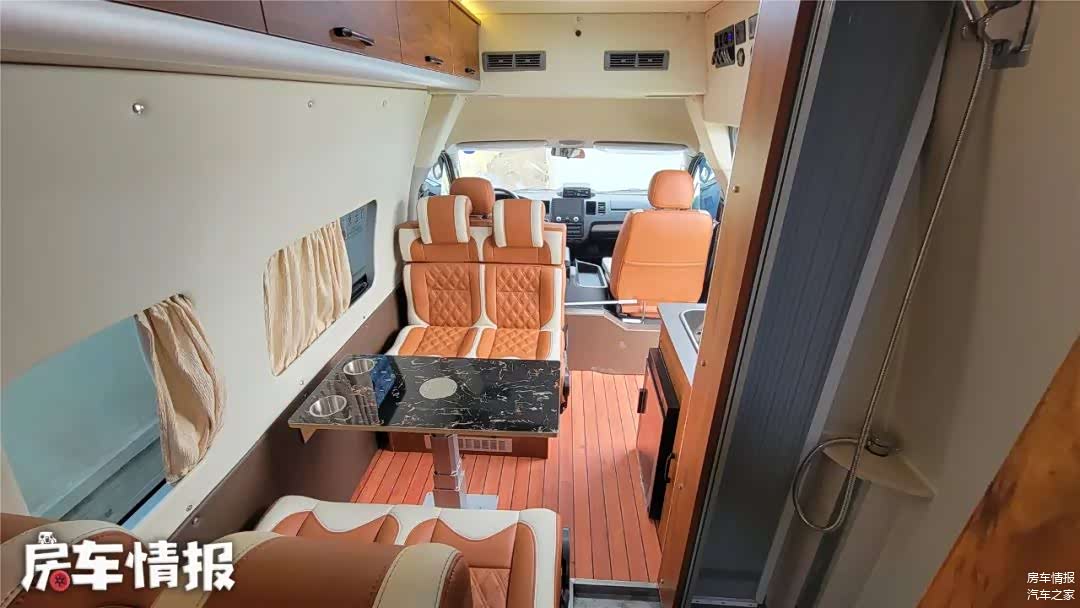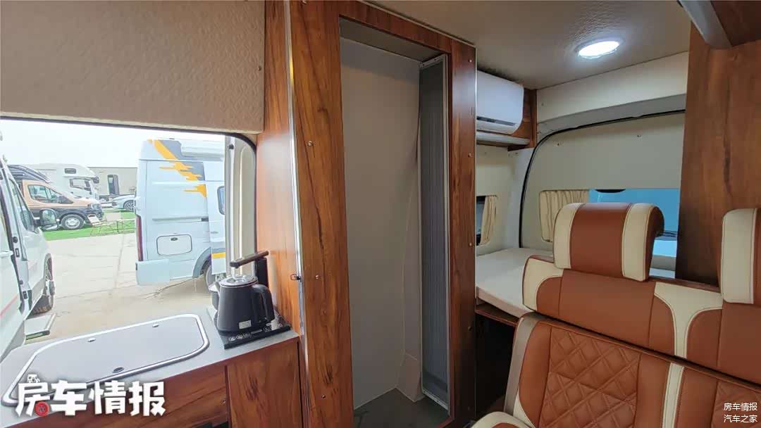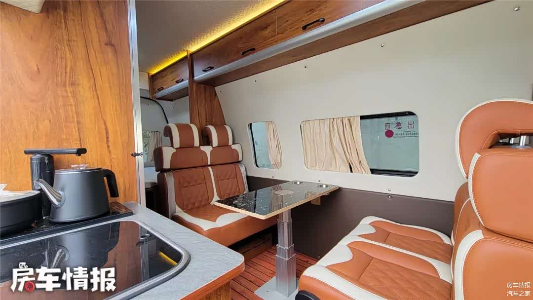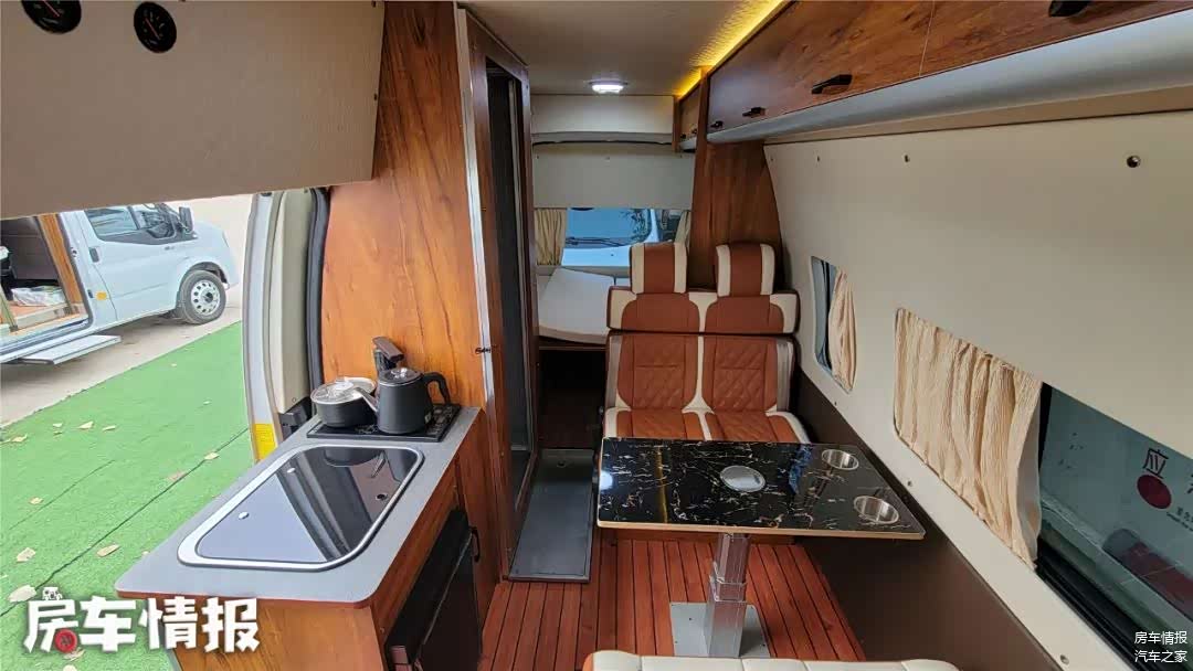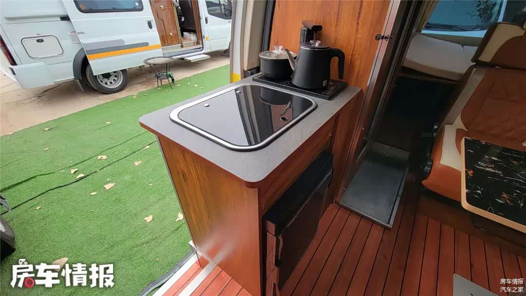 靠近车厢侧滑门旁是一个小型厨台操作区域,这里提供了洗菜池、冰箱,比较有意思的是这里并没有设置电磁炉,而是换成了一个可以烧水的茶台,对于喜好喝热水、茶人的人来说,是个贴心设计,毕竟大多数人也不会在这里做饭。