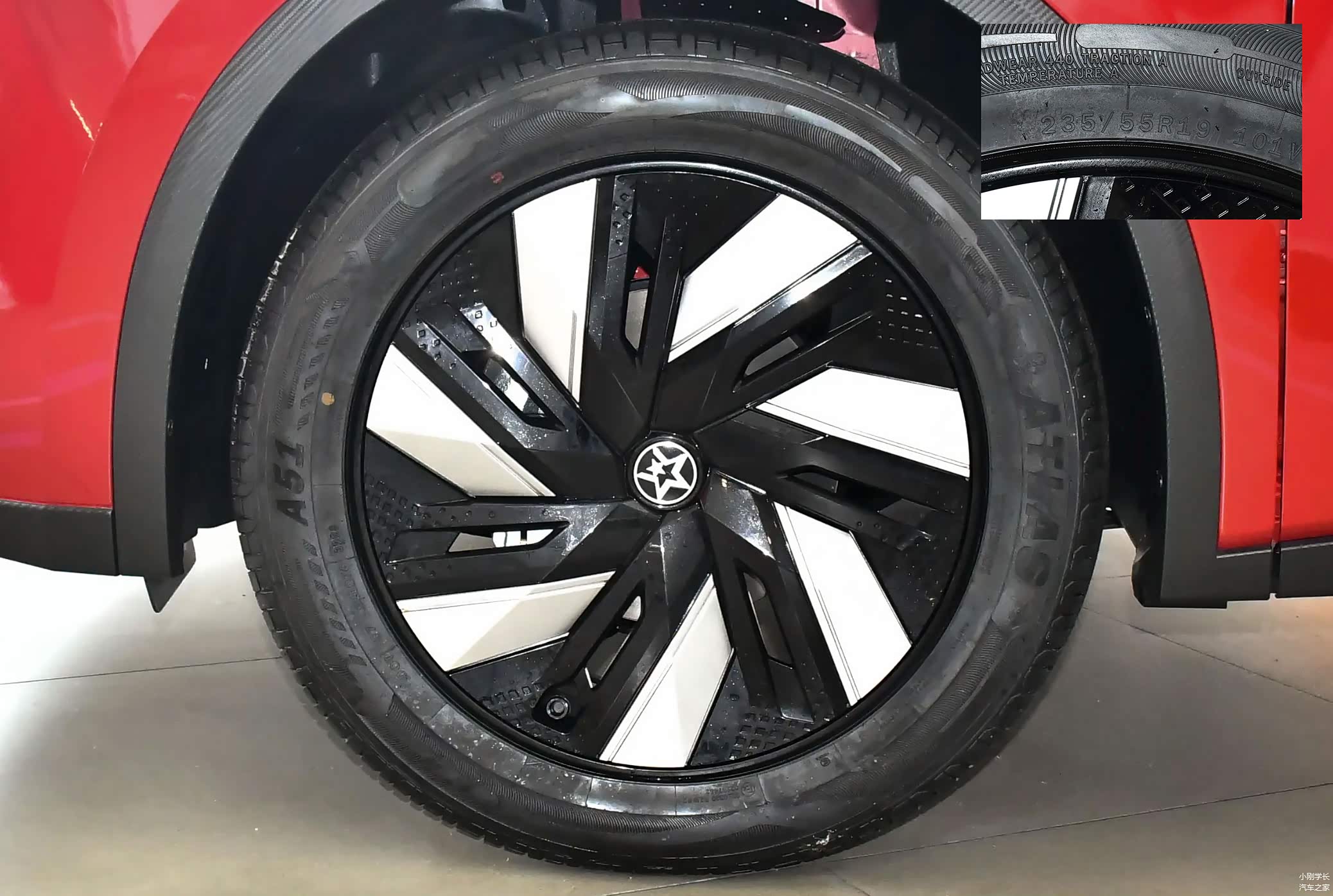 提供了 18 英寸和 19 英寸两种轮圈尺寸,轮圈采用双色配搭组合,除了 60km iC 版为18英寸之外,其余车型为 19 英寸,实拍车型为 110km iE 版,轮胎尺寸为 235/55 R19。
