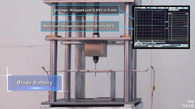 如果用10多厘米的大钉子穿透NCM电池,瞬间会发生热爆炸,并产生火焰和烟雾,从而引发火灾,但比亚迪的刀片式电池在没有烟雾或火灾的情况下保持原样。