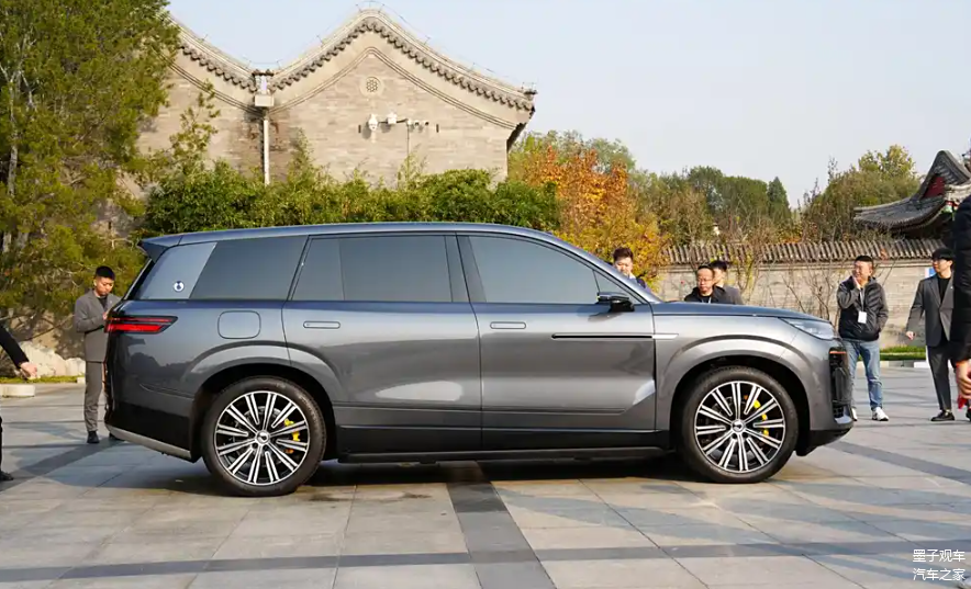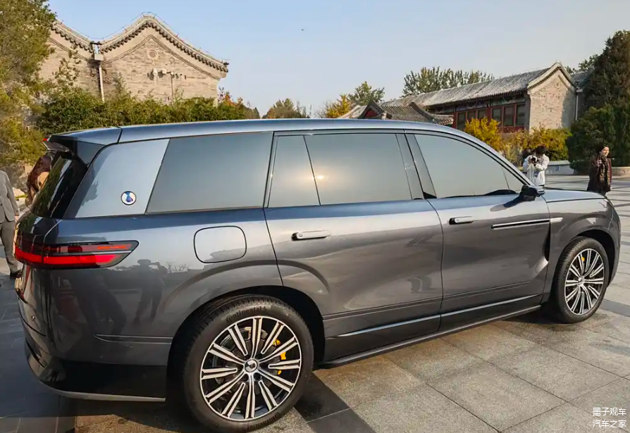 从车身侧面看,方正大气的造型设计很有辨识度,腰线平直,B柱和C柱都是黑色高亮涂装。此外,这款车还配备了隐藏式的门把手、电动脚踏板以及悬浮式车顶,科技感十足。尾部方面整体造型依旧采用呼应车头的方正硬朗的设计风格,尾灯方面同样采用与腾势Z9GT一样的对称分布的窄条式尾灯组,配合中部腾势品牌LOGO,在夜晚点亮后有着不错的辨识度。