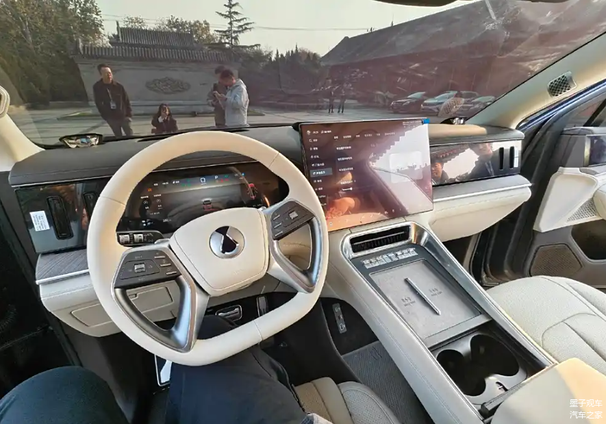 内饰同样采用与腾势Z9GT相似的设计风格,四幅式方向盘设计,加上13.2英寸的全液晶仪表盘和副驾娱乐屏,加之中间17.3英寸悬浮式中控大屏,以及50英寸AR-HUD抬头显示,不过中控台设计比Z9GT更加科学合理,采用了怀挡设计风格,让中控台可以放置更多的物品。此外配置方面,可以看到水晶物理按键、双50W手机无线充电等也都一并提供。