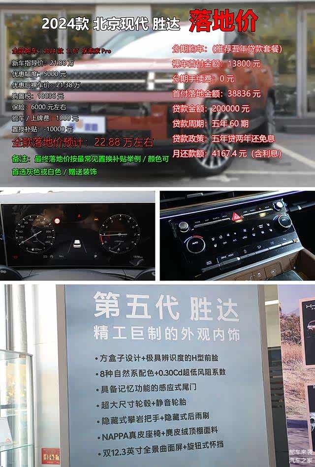 《郝车来袭》总结:相信通过郝哥的介绍,您对2024款北京现代第五代胜达也有了更深入了解,以上所有数据均为郝哥粗略估算,仅供您购车时预算参考。与此同时,郝哥还根据店内销售人员了解到,北京现代其它车型也均有不同程度的优惠,例如2023款沐飒(此前ix35)直降2.6万元,2024款库斯途优惠2.5万,2023款伊兰特优惠3.6万,2023款途胜更狂降4万元,当然知名度最高的索纳塔也有1.5万的优惠力度,其中店内还有一辆索纳塔特价车可以优惠到2万,不知道有没有您相中的呢?如果您想知道郝哥暗访的是北京地区哪家北京现代4S店也可以留言或私信给我,我会偷偷告诉你的哦,感谢您关注《郝车来袭》。