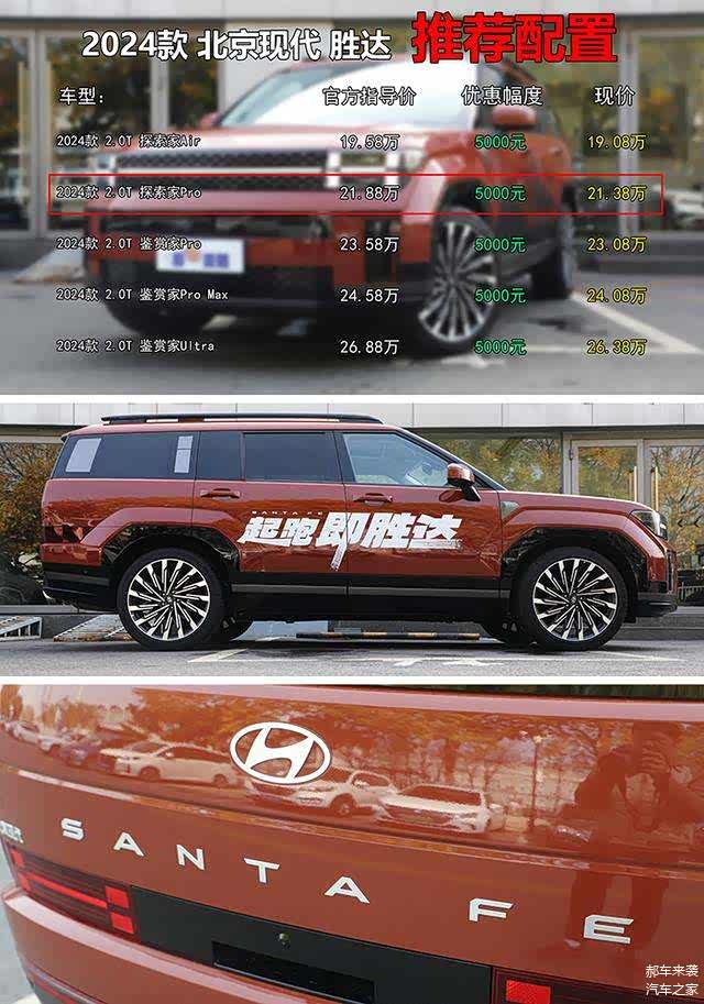近日,根据郝哥暗访北京地区某北京现代4S店得知,北京现代第五代胜达共在售五款车型,售价区间为19.58万~26.88万元,通过店内获悉,新车目前全系直降5000元,最终通过配置分析并结合优惠情况,郝哥推荐您首选次低配2.0T 探索家 Pro。理由也很简单,首先入门版探索家Air裸车价不到20万,价格则成为了其最大的竞争力,但配置的确有点惨淡,没有天窗,甚至连空调都是手动的,所以郝哥并不推荐购买。