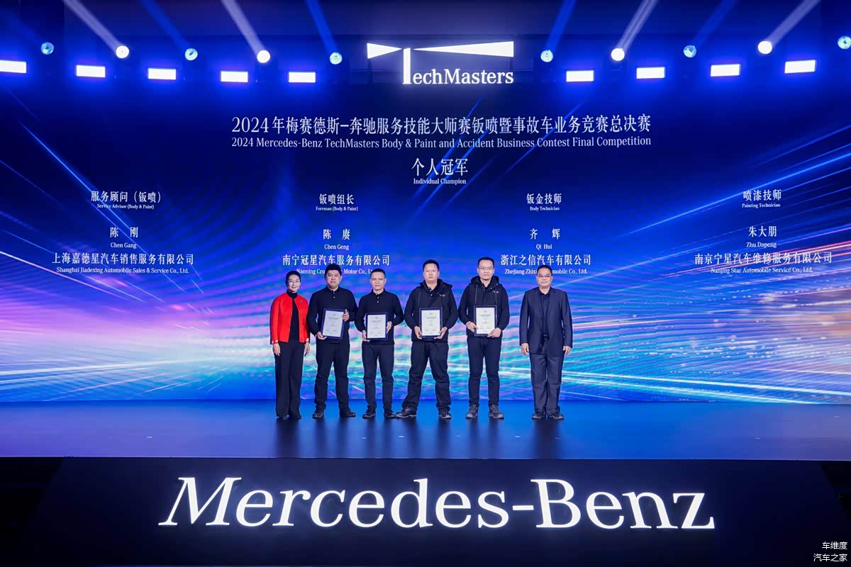 历经近四个月的白热化角逐,来自全国授权经销商的近3500名选手在这场技能盛宴中各展风采。最终,浙江之信汽车有限公司脱颖而出,斩获最佳团队奖冠军,南京宁星汽车维修服务有限公司与上海嘉德星汽车销售服务有限公司分别荣膺亚军与季军。在个人奖项方面,浙江之信、南京宁星、上海嘉德星团队成员分别将钣金技师、喷漆技师、服务顾问(钣喷)的个人冠军殊荣收入囊中,南宁冠星汽车服务有限公司团队成员则成功摘取钣喷组长个人冠军桂冠,他们用精湛技艺和专业素养彰显了奔驰服务团队的顶尖实力,也为奔驰服务品质树立了全新标杆。