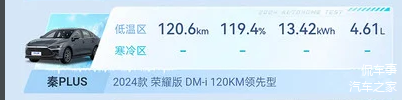 在本次汽车之家2024冬季首测中,秦PLUS DM-i以其惊人的续航达成率119.4%夺得了所有测试车型中的第二名。这意味着,在相同的低温条件下(5°C~15°C),它不仅能够保持高效的能量利用率,而且还能超出预期地提供更多的行驶里程。