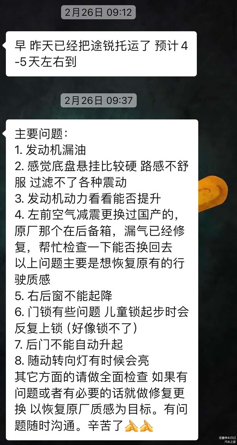 回归正题,今年2月底,车主把车安排过来的,翻新的需求也描述给我了,其实可以看出,车主是以机械方面实用为主,主要就是行驶质感和动力,对外观和内饰并没有太多要求。