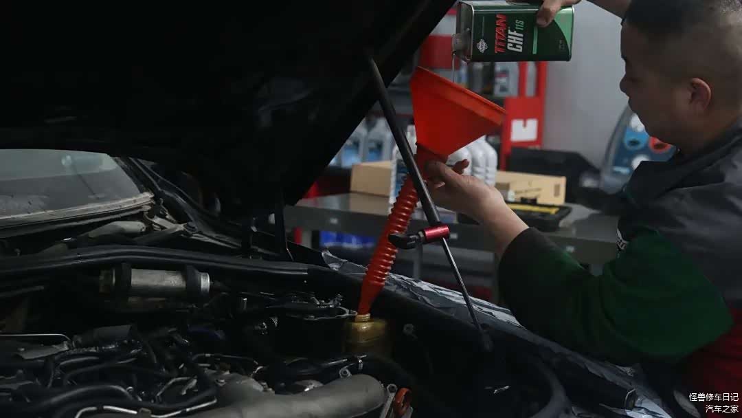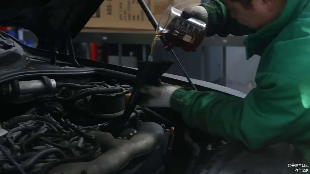 先添加发动机内部清洗剂,把里面旧油放干净。